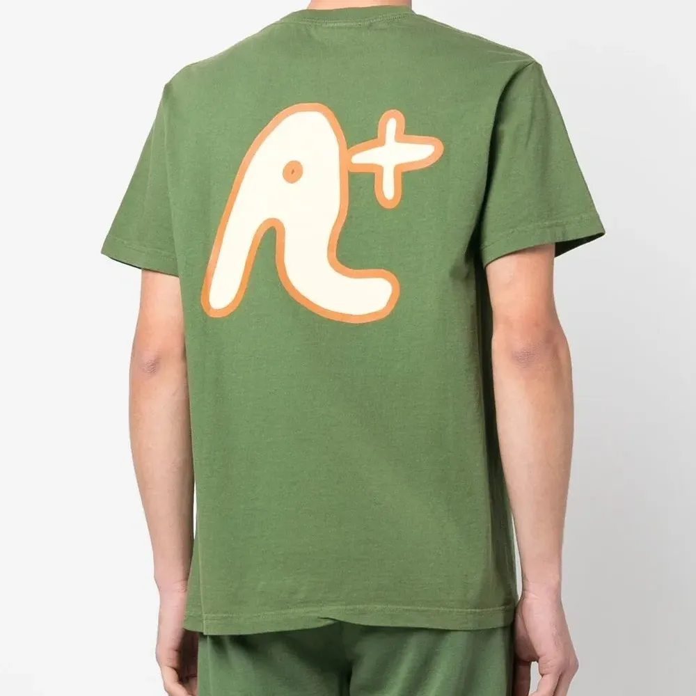 Экстракт кейла, зеленый, переработанный хлопок, текстовый принт, круглый вырез, короткие рукава и прямой подол.