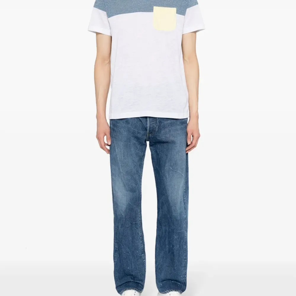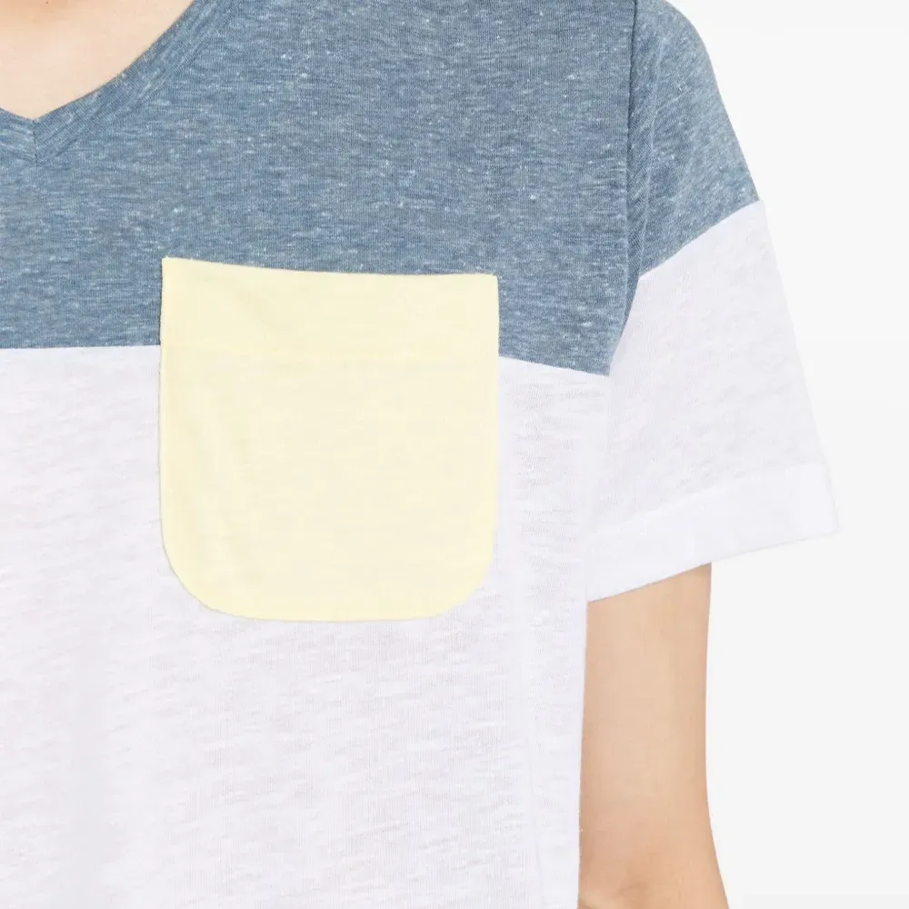 Белый, голубой, смесовый хлопок, ткань джерси, дизайн колор-блок, V-образный вырез, короткие рукава и прямой подол.