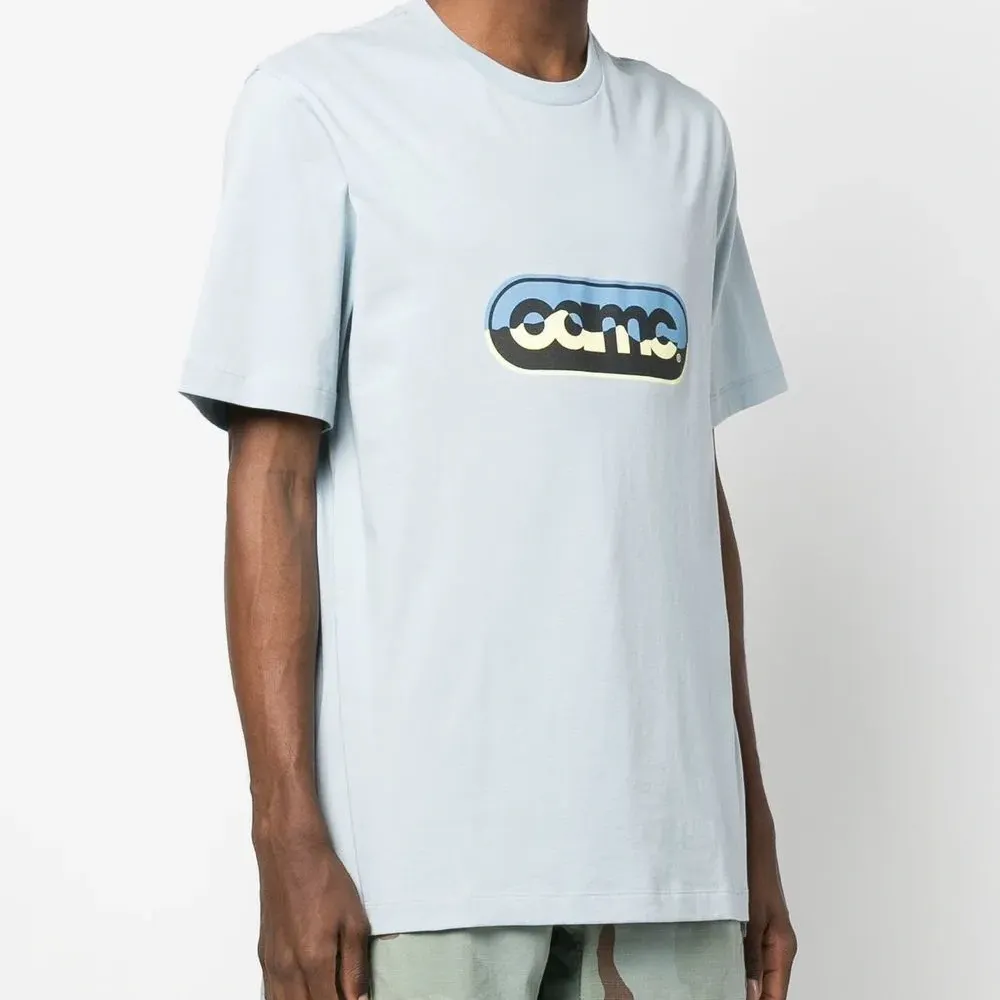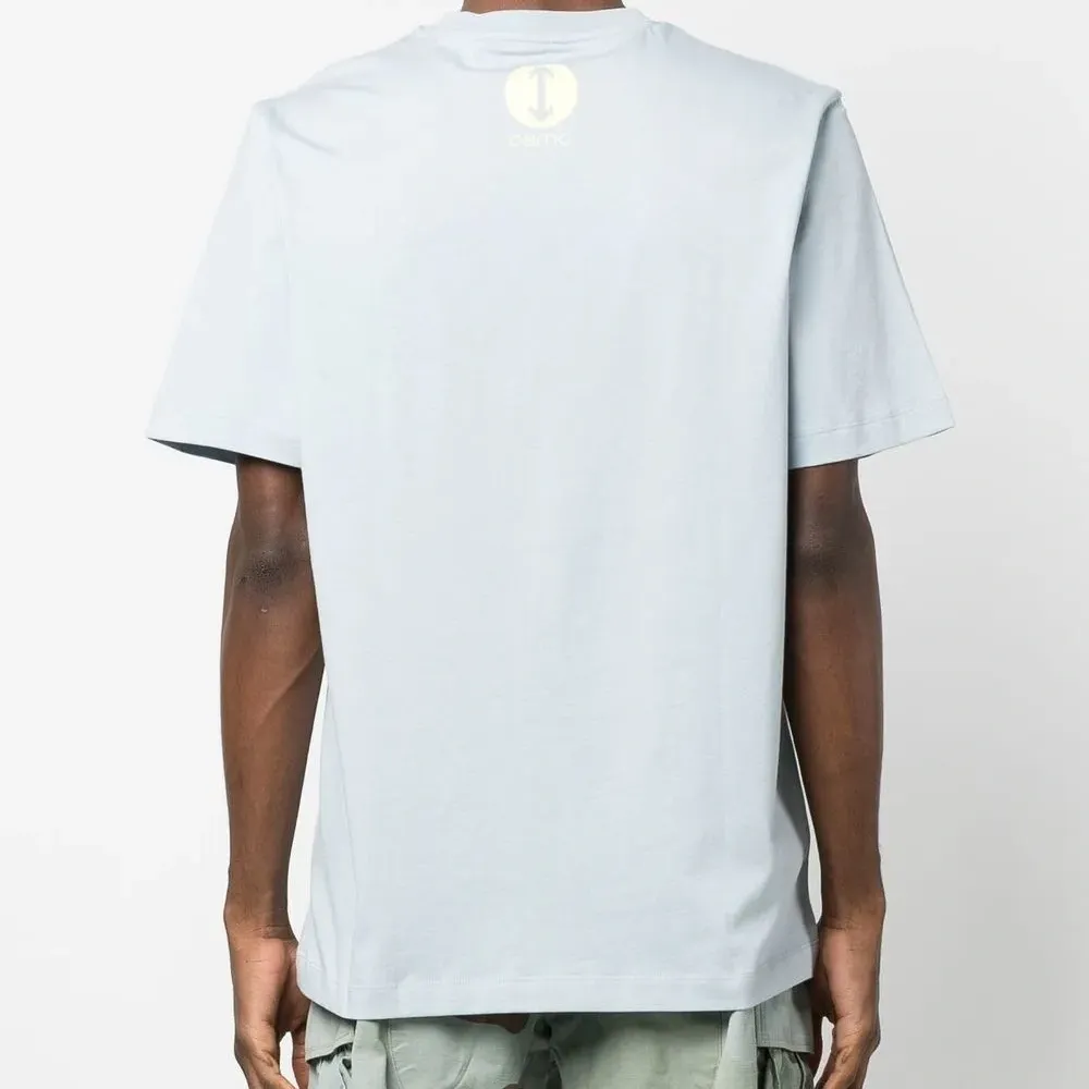 Пудрово-голубой, хлопок, принт с логотипом на груди, принт с логотипом сзади, круглый вырез, короткие рукава и прямой подол.