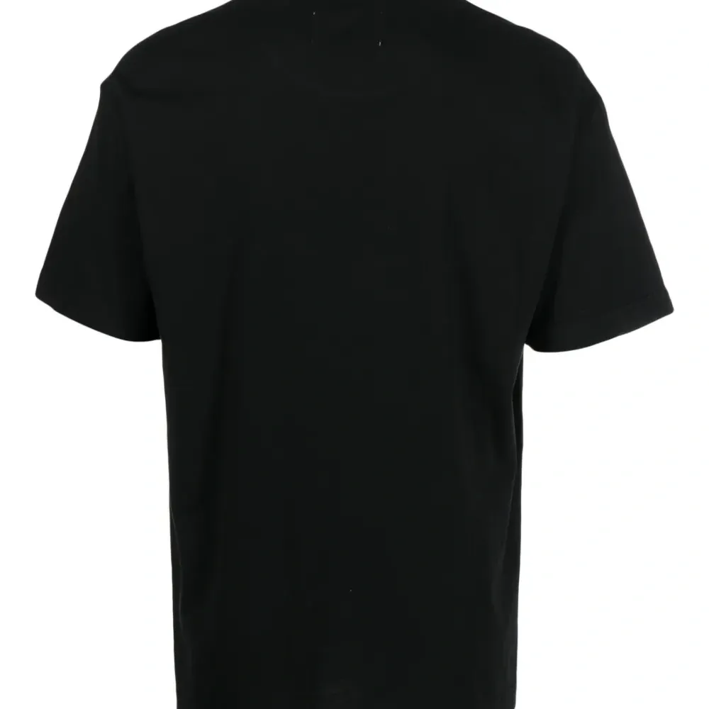 Черный, хлопок, логотип спереди, круглый вырез, короткие рукава и прямой подол.