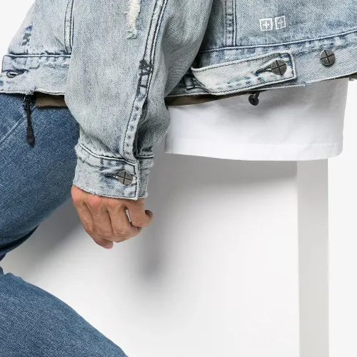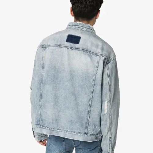 Голубая джинсовая куртка из вареного хлопкового денима от Ksubi. Косой воротник, застежка на пуговицах спереди, передний карман с клапаном, прорезные карманы по бокам, длинные рукава, манжеты на пуговицах, размытый кислотный принт и эффект потертости.