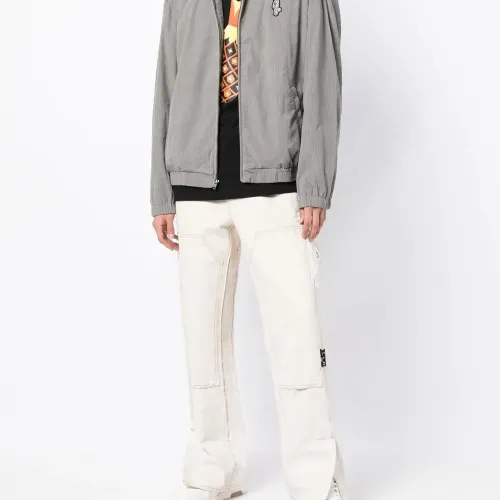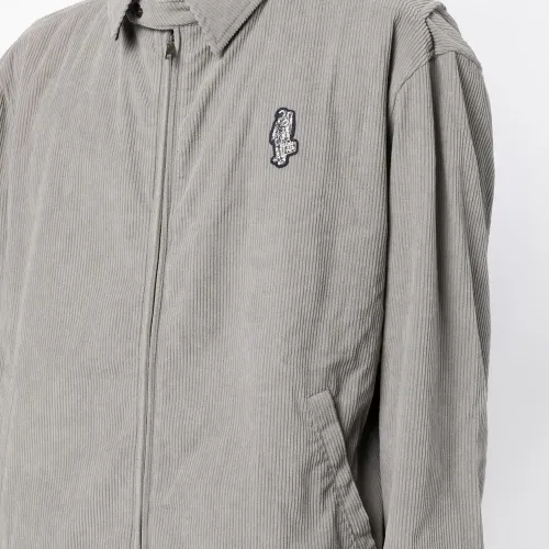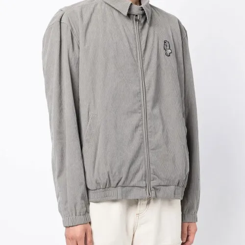 Светло-серый, принт с логотипом сзади, нашивка с логотипом спереди, классический воротник, застежка на молнии спереди и длинные рукава.