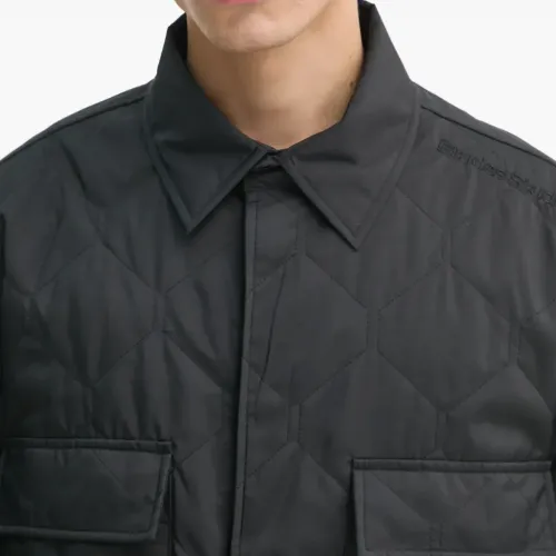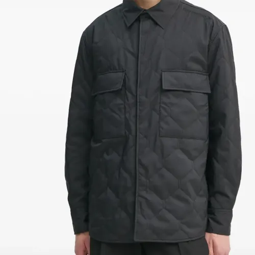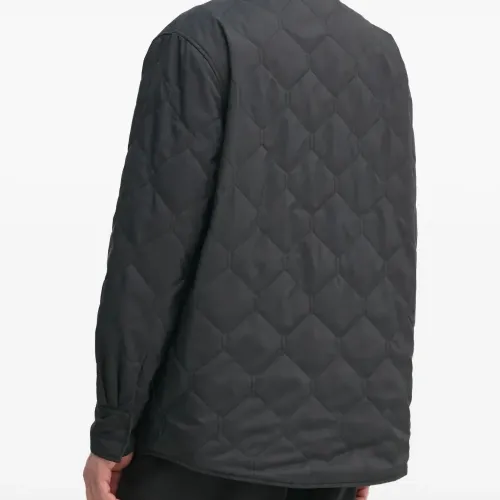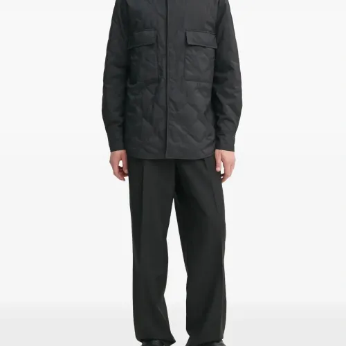 чёрный стёганый дизайн, отложной воротник, скрытая застёжка спереди, длинные рукава, два нагрудных кармана с клапанами