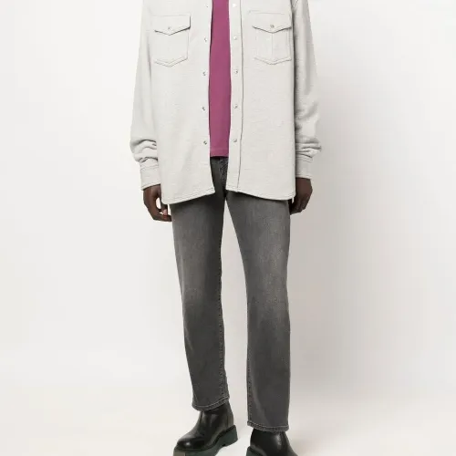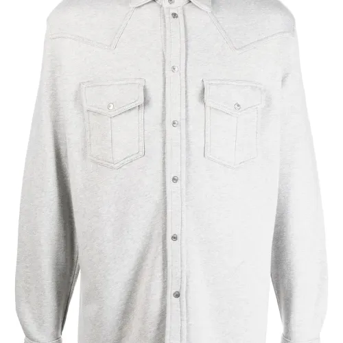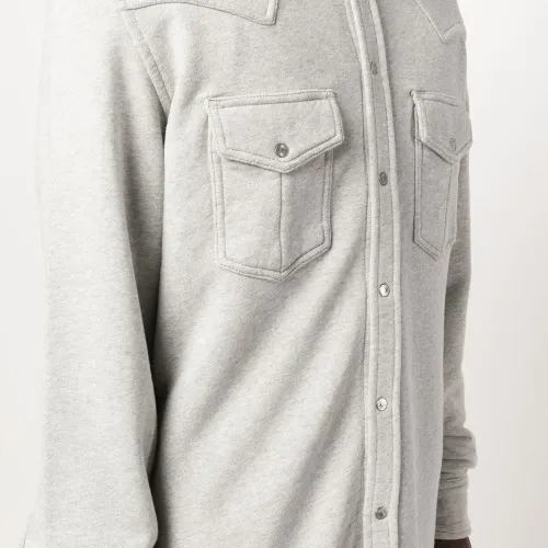 Застежка на кнопках спереди, длинные рукава, два нагрудных кармана с клапанами и закругленный подол.