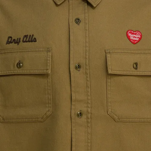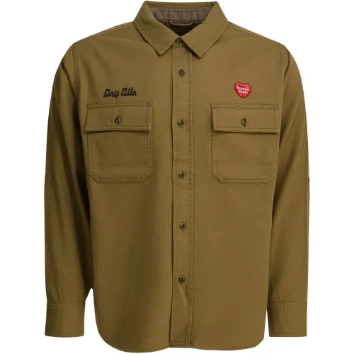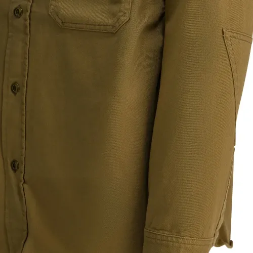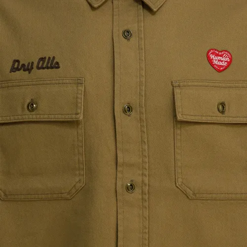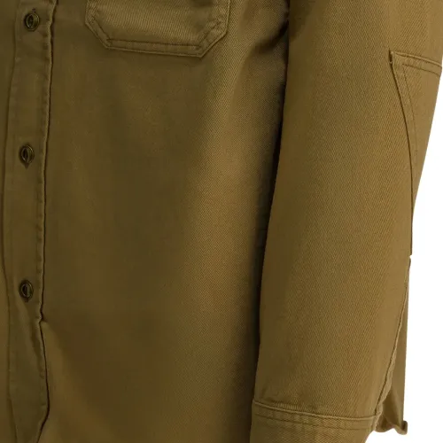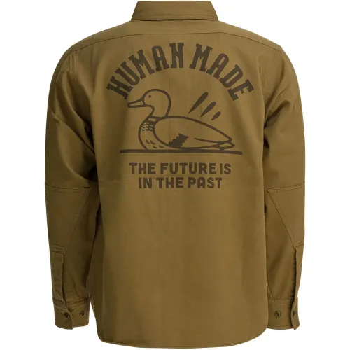 бежевый цвет, застежка на пуговицы спереди, два нагрудных кармана с клапанами, длинные рукава, вышитый рисунок, графический принт на спинке