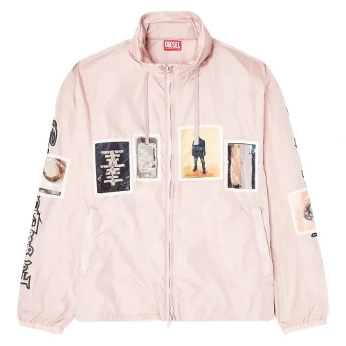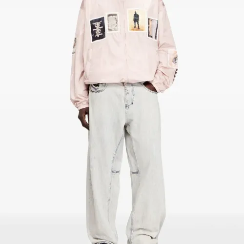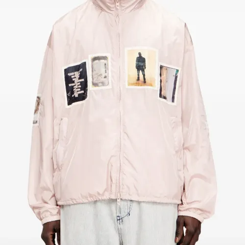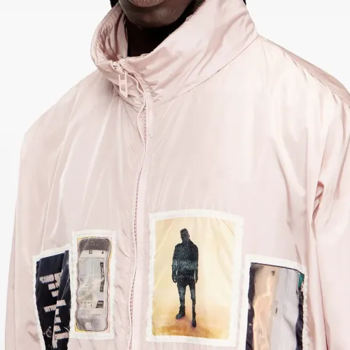 светло-розовые графические нашивки, надпись на рукаве, карманы на молнии, кулиска на подоле