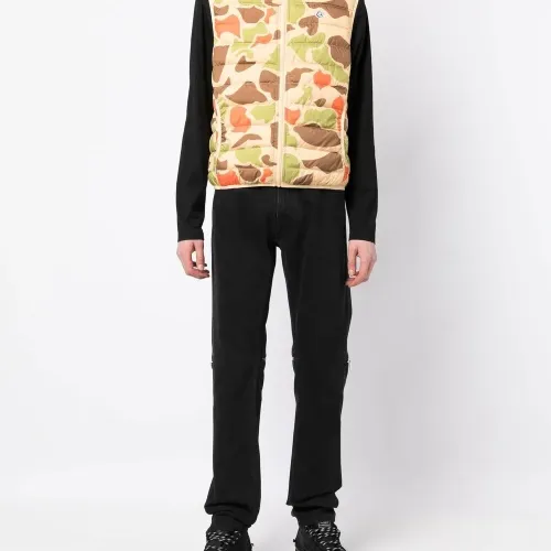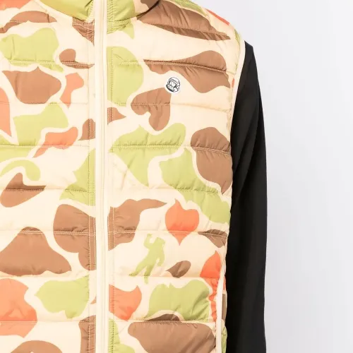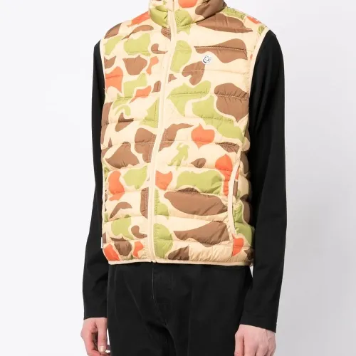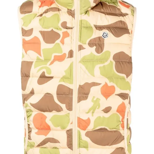 Дутый материал, камуфляжный принт, нашивка с логотипом спереди, воротник-труба и без рукавов.