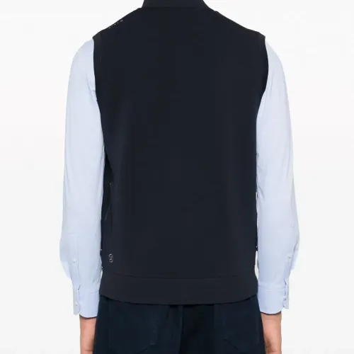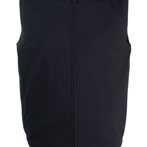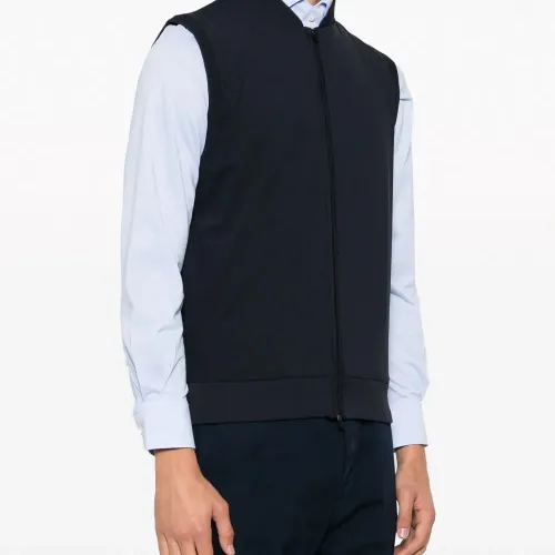 Темно-синий, стрейчевая ткань, бейсбольный воротник, двусторонняя молния спереди, без рукавов и прямой подол. Этот товар как минимум на 50% состоит из переработанных или повторно использованных материалов. Узнать больше о том, какие товары получают отметку «Ответственный выбор», можно из материала «Как мы оцениваем экологичность и этичность».