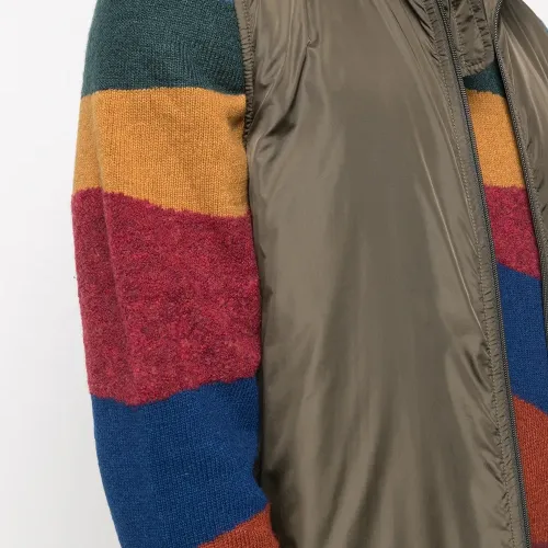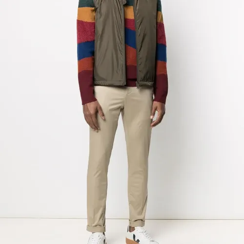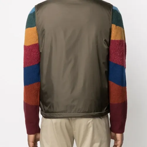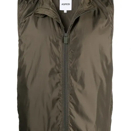 Высокий воротник, застежка на молнии спереди, без рукавов и два прорезных кармана по бокам.