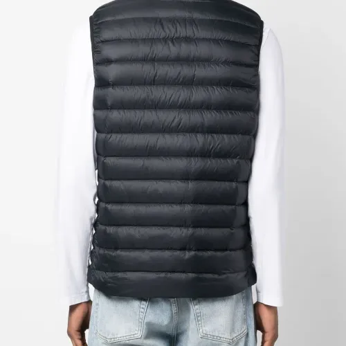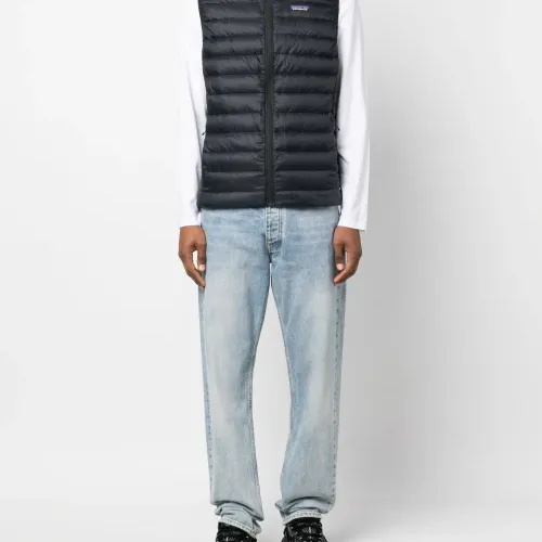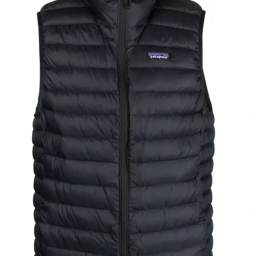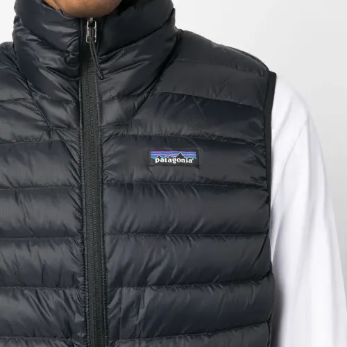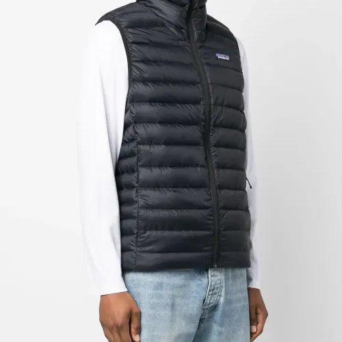 Черный, наполнитель из пуха и перьев, переработанный нейлон, дутый материал, высокий воротник, застежка на молнии спереди, без рукавов и два кармана на молнии по бокам. Этот товар как минимум на 50% состоит из переработанных или повторно использованных материалов.