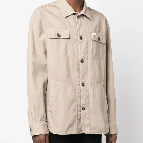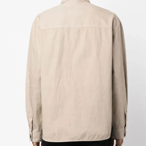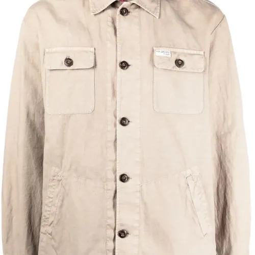 Песочно-бежевый, классический воротник, застежка на пуговицах спереди, нашивка с логотипом на груди, нагрудный карман на двух пуговицах, длинные рукава, манжеты на пуговицах, два прорезных кармана сбоку и закругленный подол.