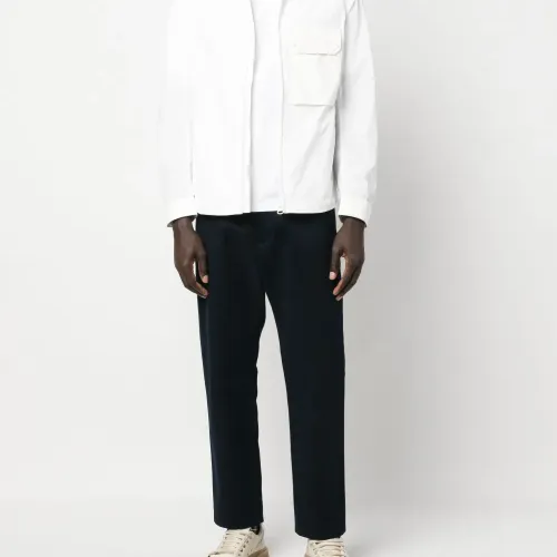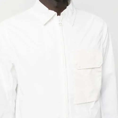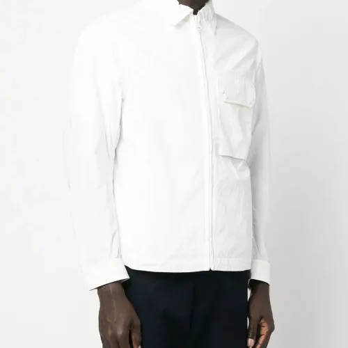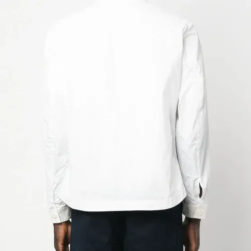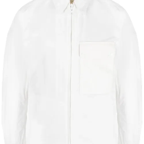 Белый, хлопок, классический воротник, застежка на молнии спереди, нагрудный накладной карман, два прорезных кармана по бокам, длинные рукава и прямой подол.