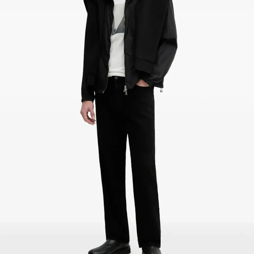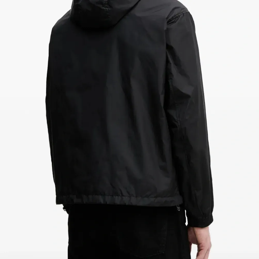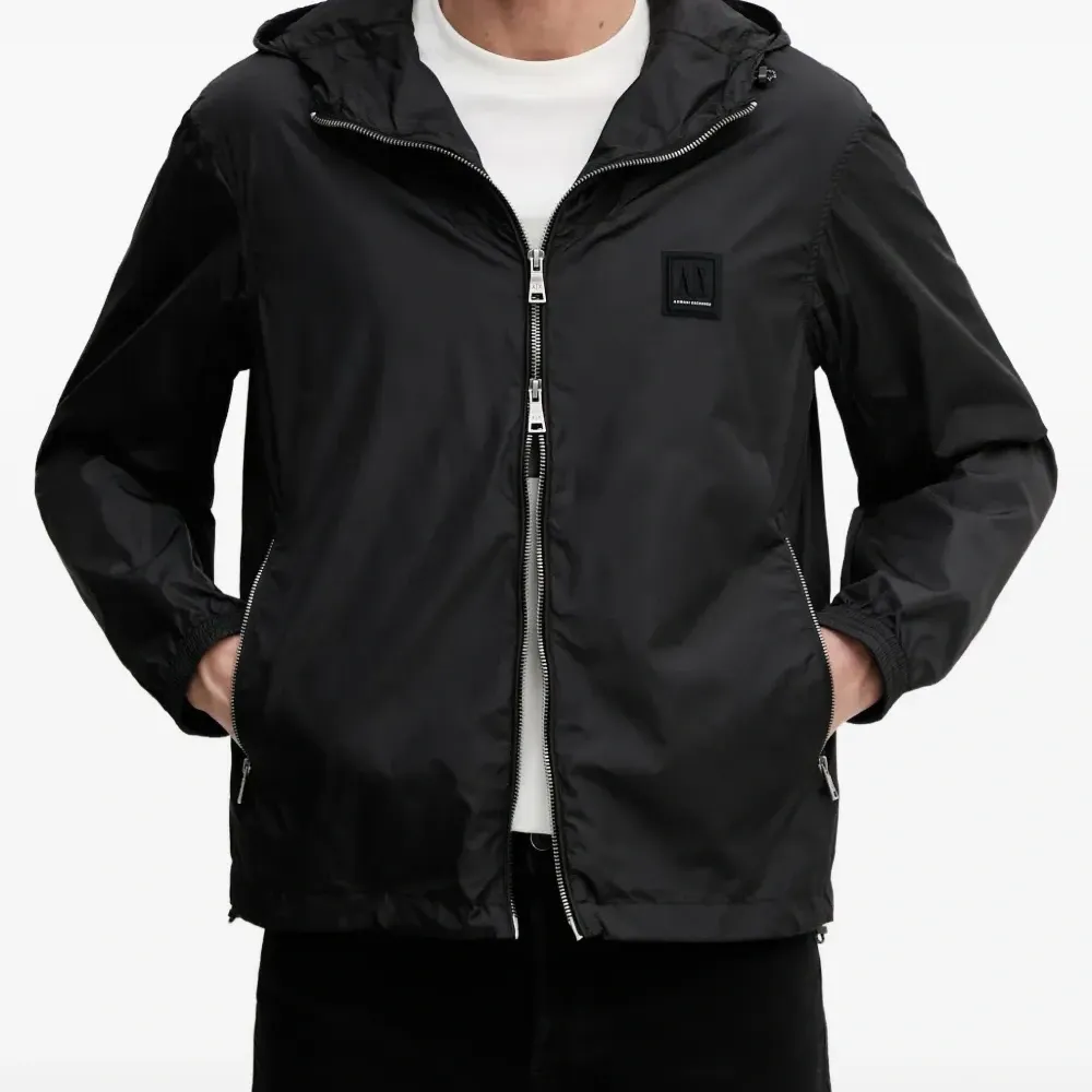 черная куртка с застежкой-молнией, капюшоном на кулиске, нашивкой с логотипом, длинными рукавами и эластичным низом