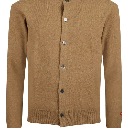 коричневый цвет, застёжка на пуговицы, ребристый низ, ребристые манжеты, круглый вырез, мотив в виде сердца