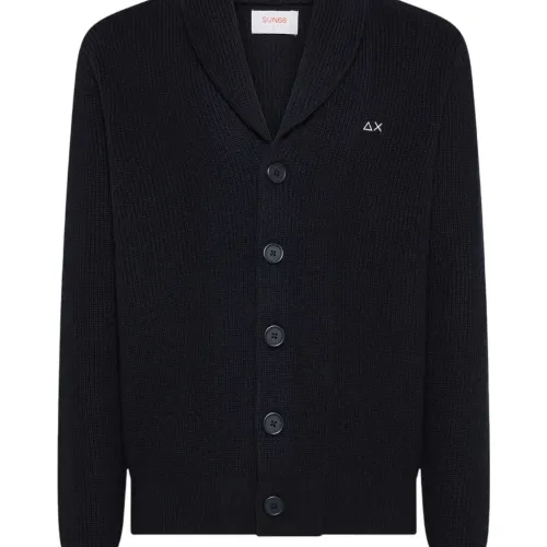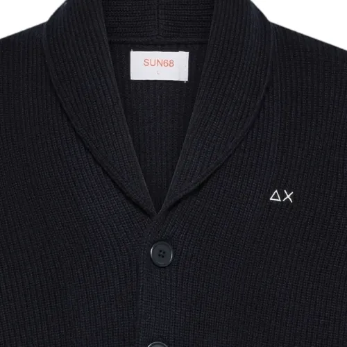 темно-синий в рубчик, застежка на пуговицы, длинные рукава, шалькаобразный воротник, декоративная нашивка с логотипом