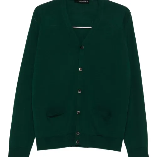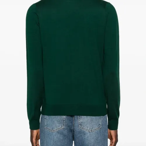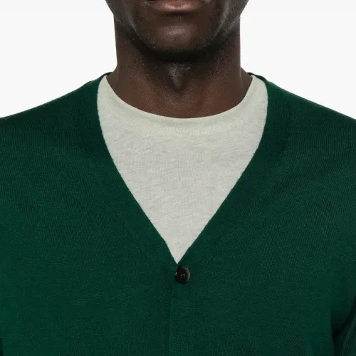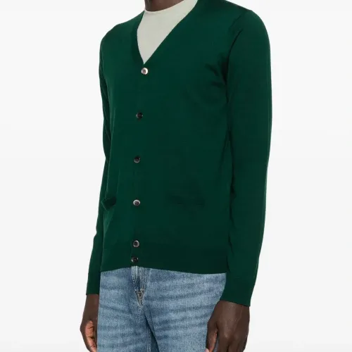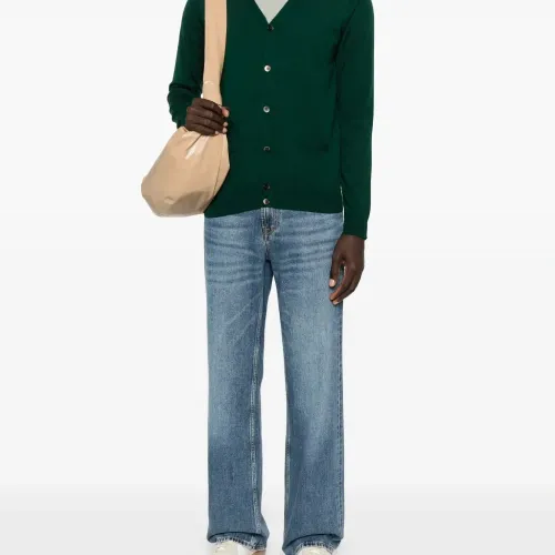 темно-зеленый V-образный вырез застежка на пуговицы спереди длинные рукава два накладных кармана спереди резинка по низу