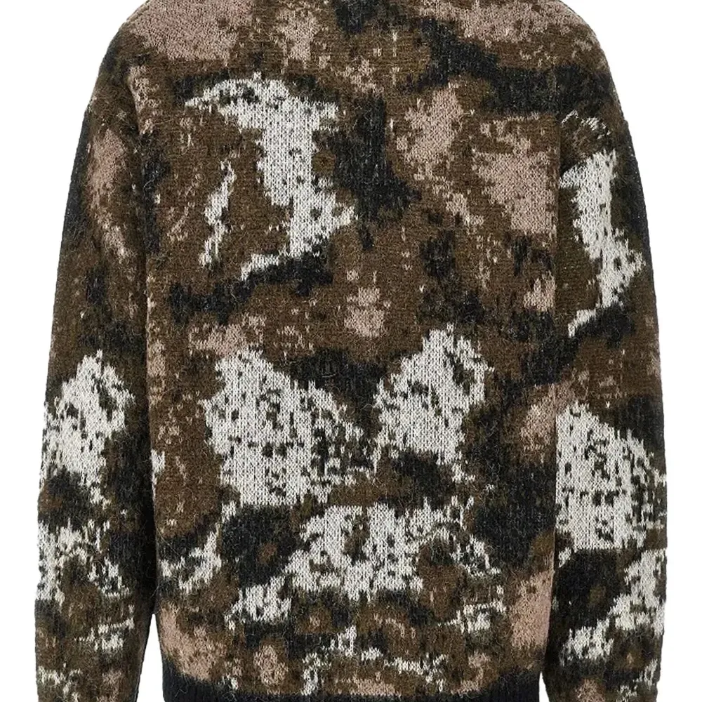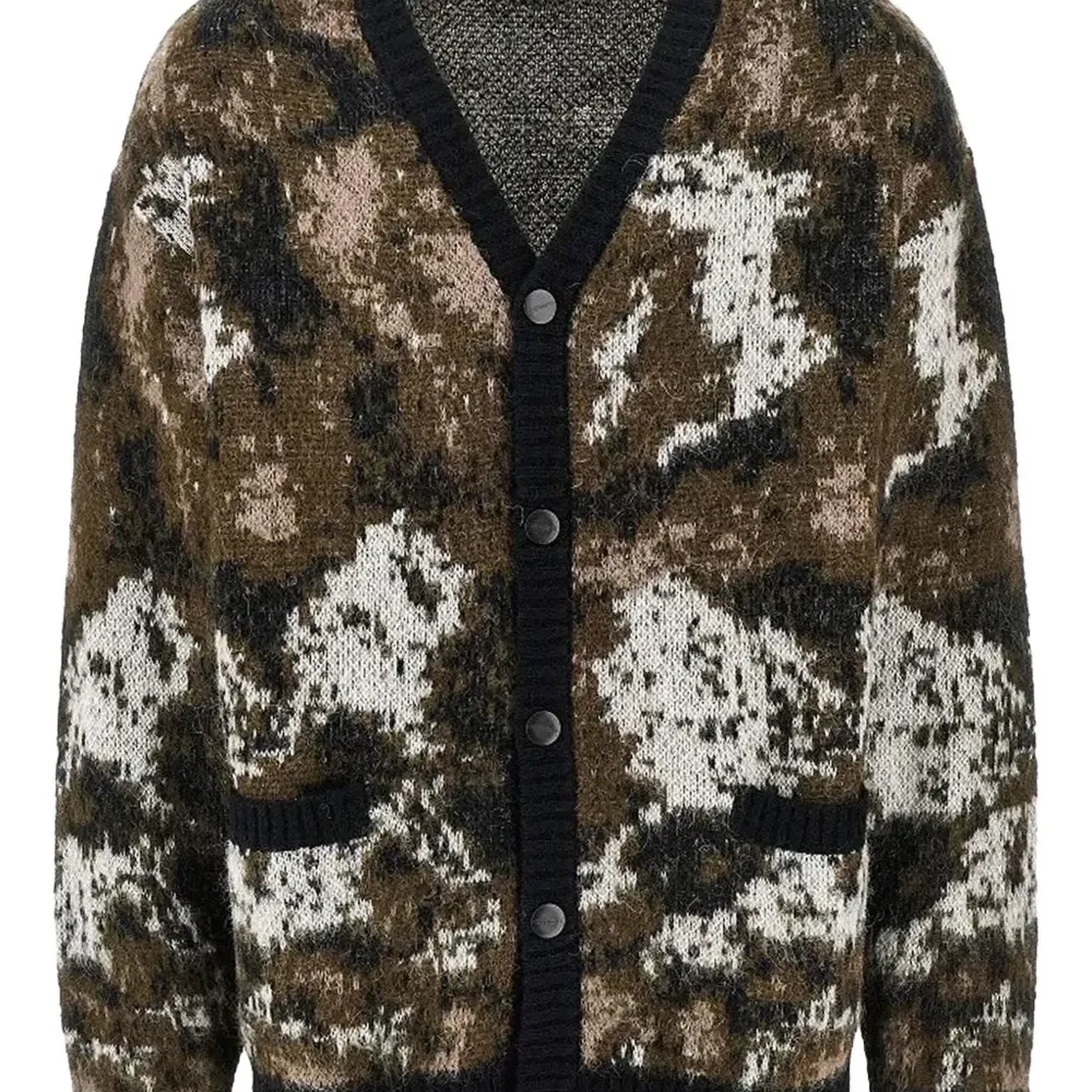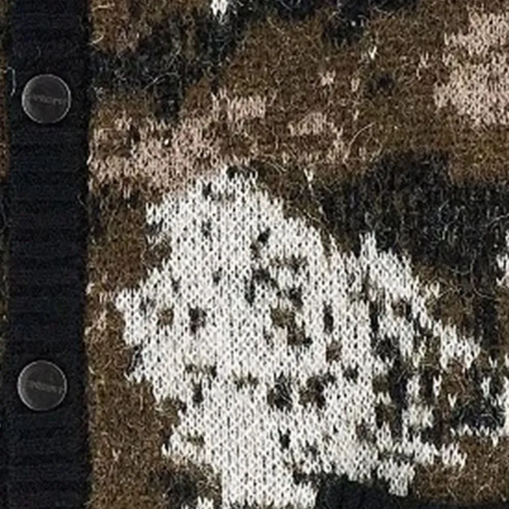 коричневый жаккардовый узор, V-образный вырез, застёжка на пуговицы, два передних кармана, рубчатые края