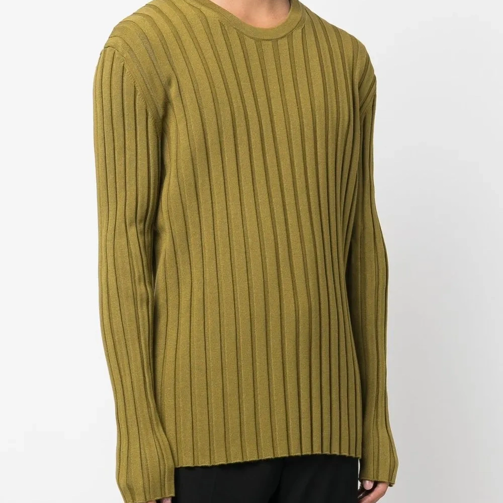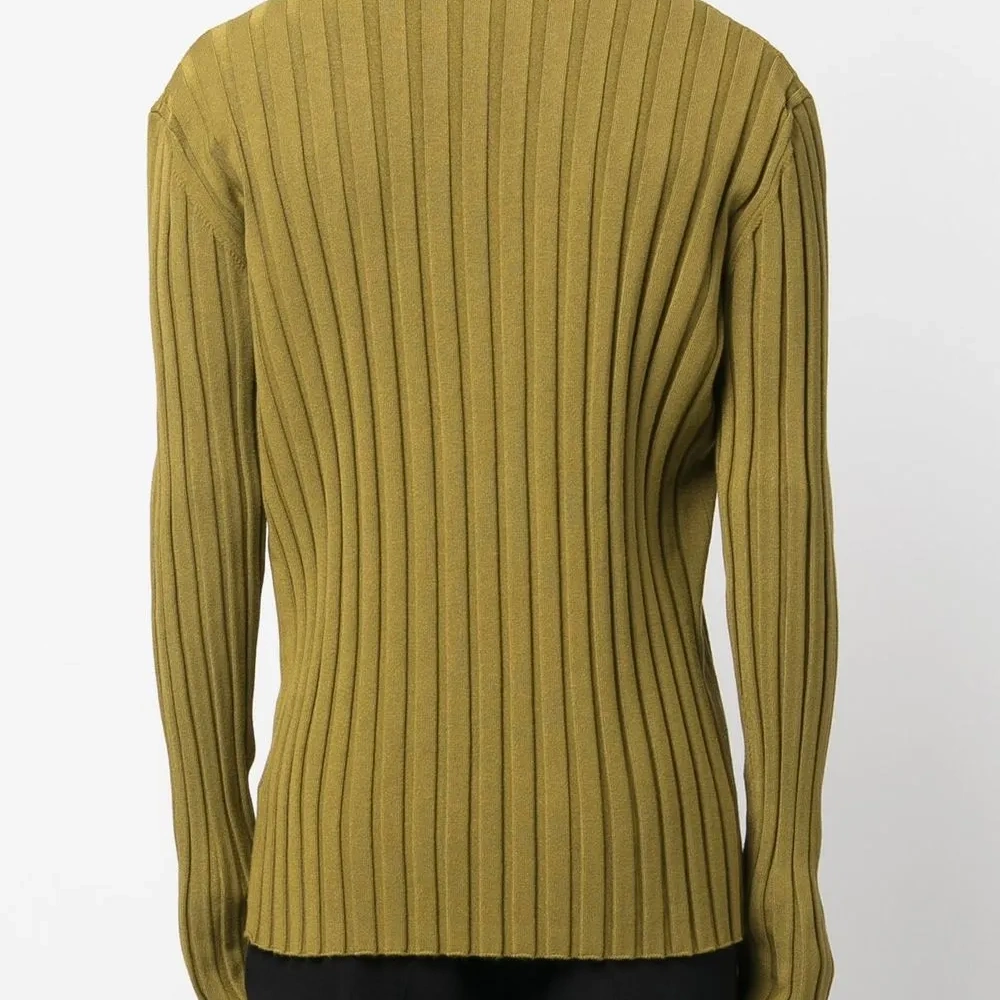 Оливковый, трикотаж в рубчик, нашивка с логотипом сбоку, круглый вырез, длинные рукава и прямой подол.