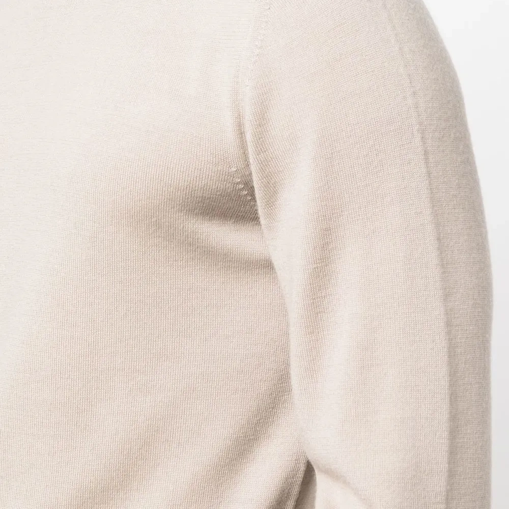 Бежевый, необработанная шерсть, трикотажный материал, круглый вырез, длинные рукава и прямой подол.