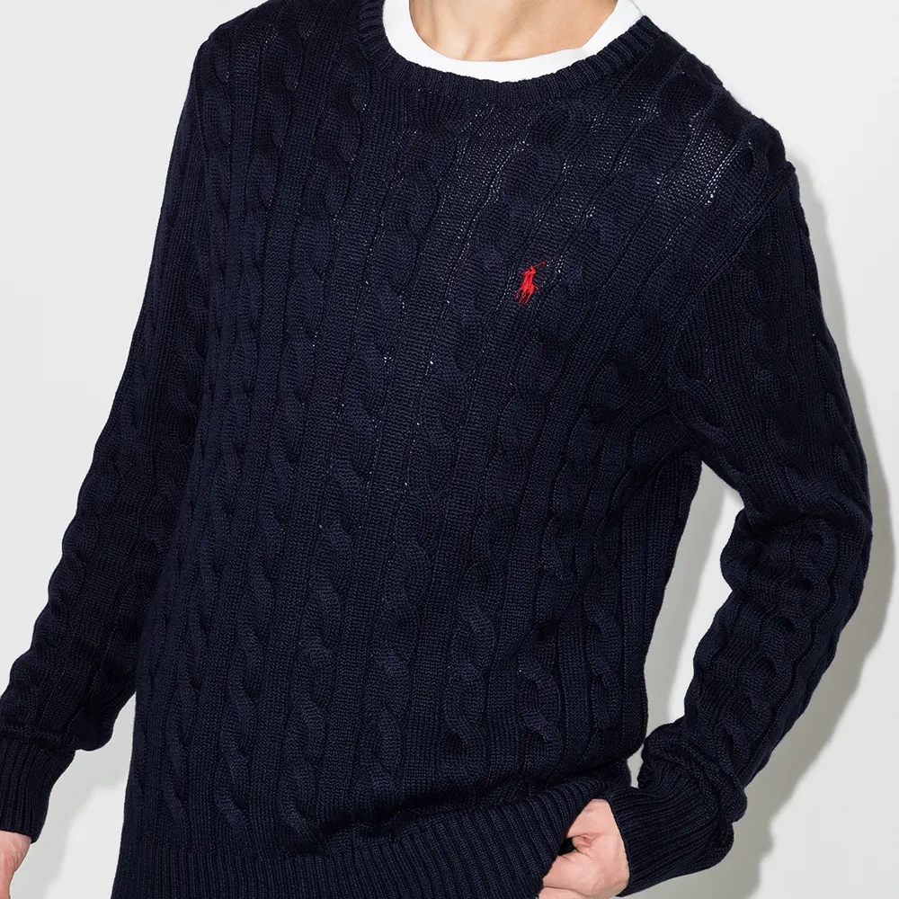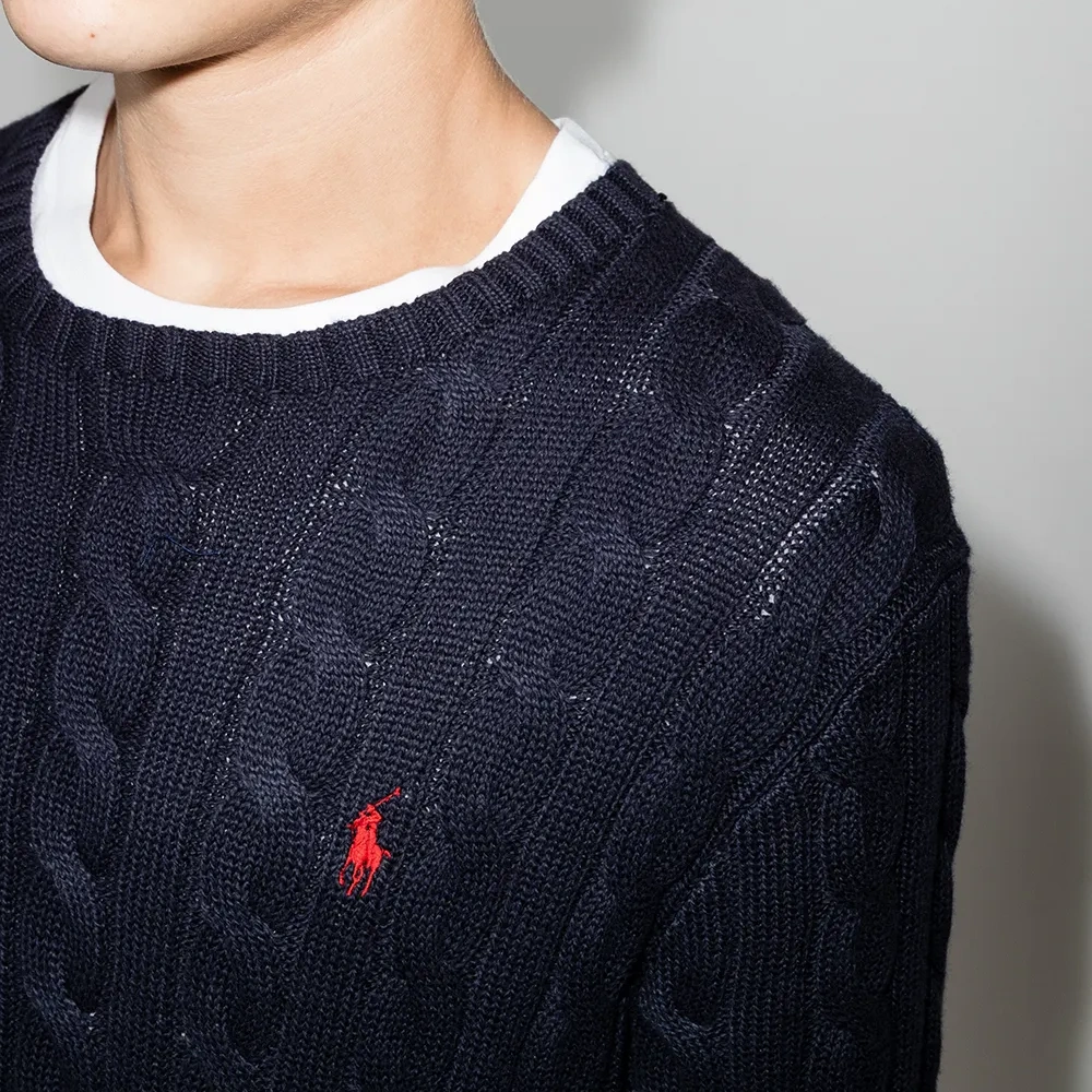 Фактурная вязка, вышитый логотип на груди, круглый вырез и длинные рукава.