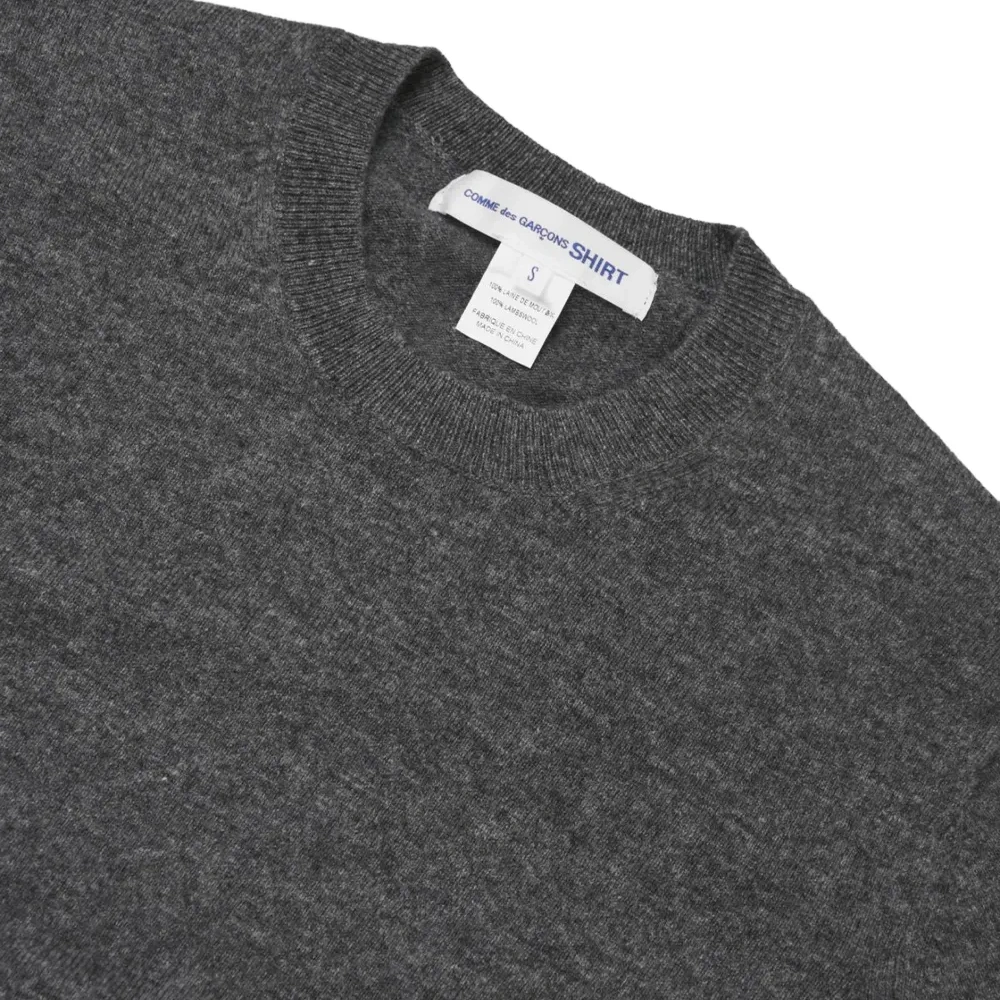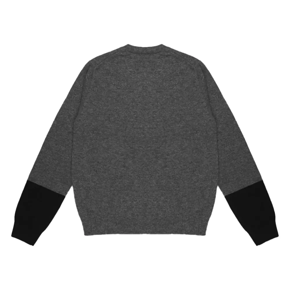 серая кофта с круглым вырезом, длинными рукавами и рубчатыми краями