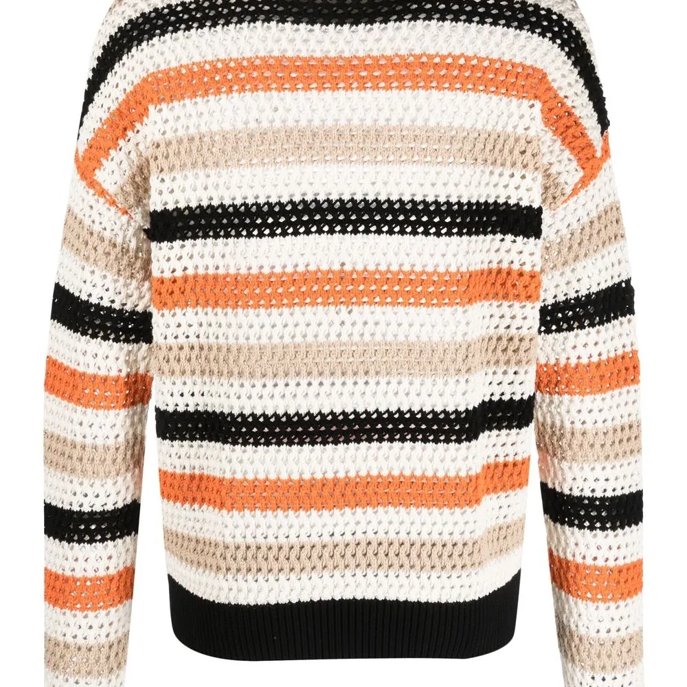 Разноцветный, хлопок, трикотажный материал, кроше, узор в горизонтальную полоску, модель анорак, длинные рукава, круглый вырез и воротник-стойка в рубчик.