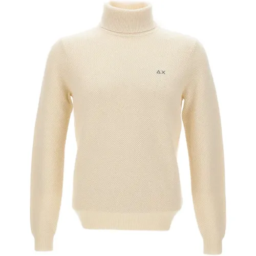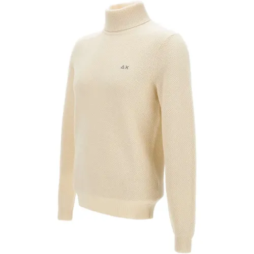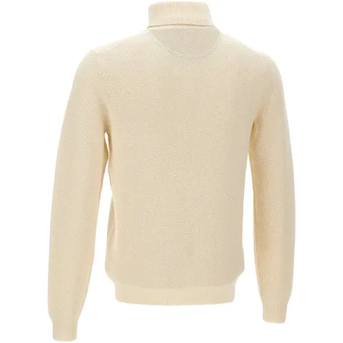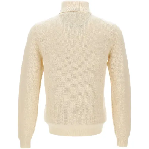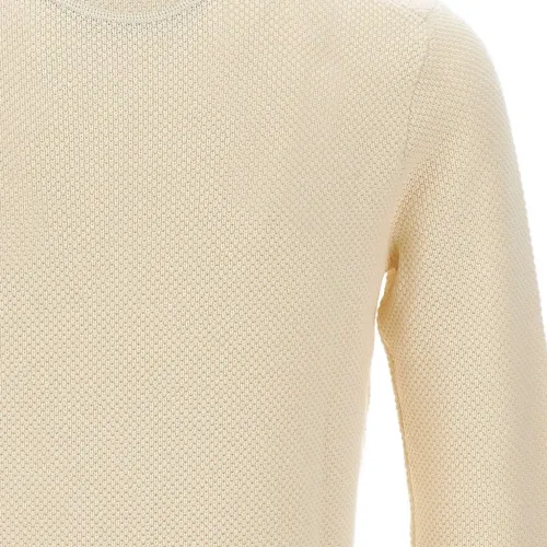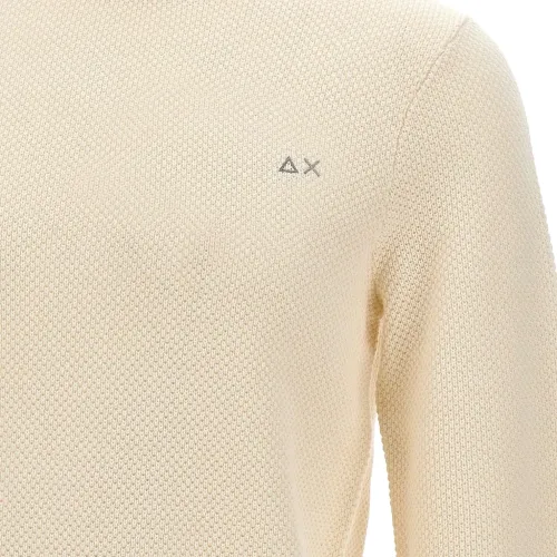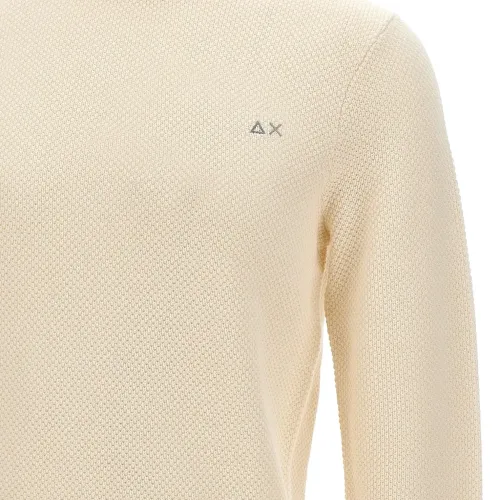 белый вязаный свитер с вышитым логотипом, высоким воротником и длинными рукавами