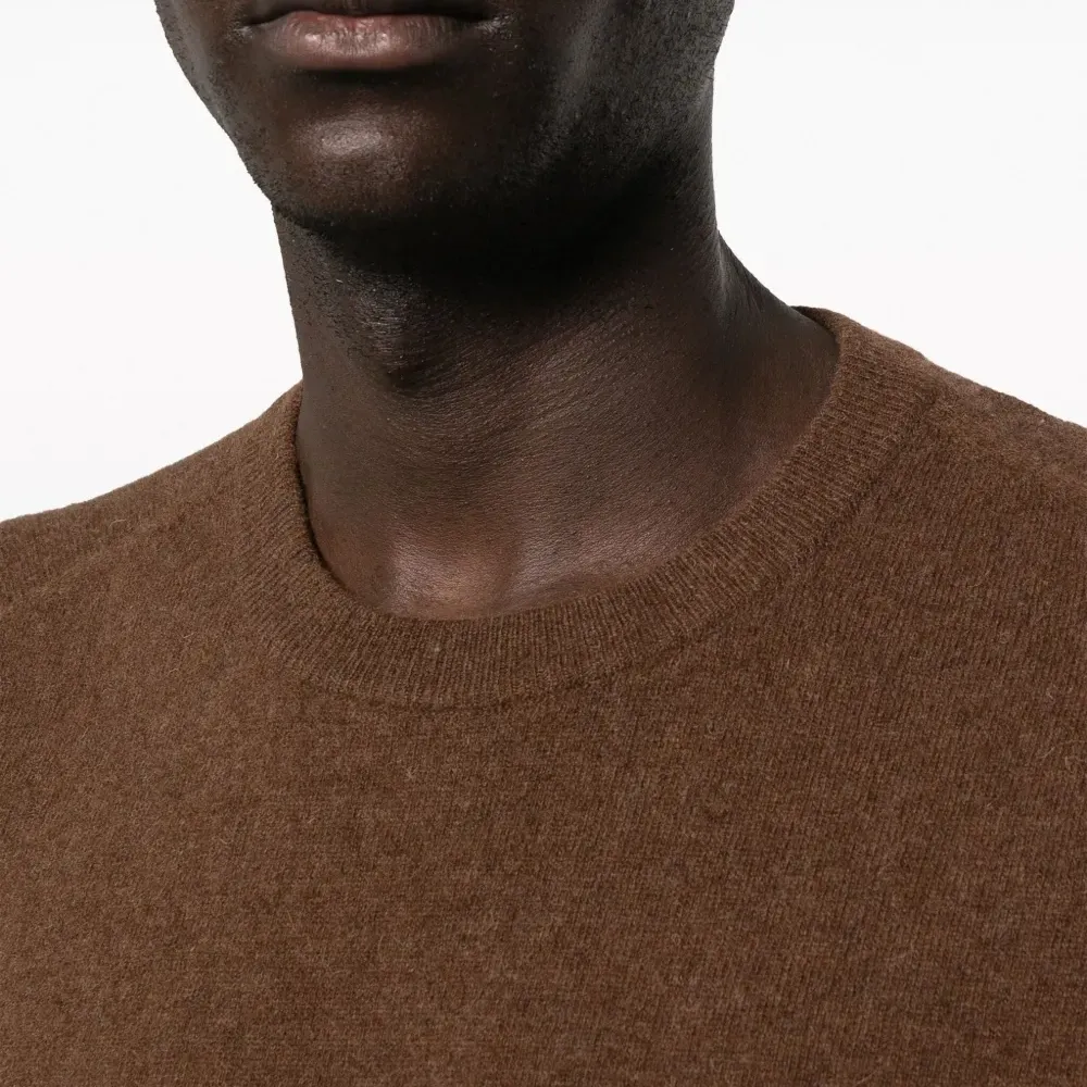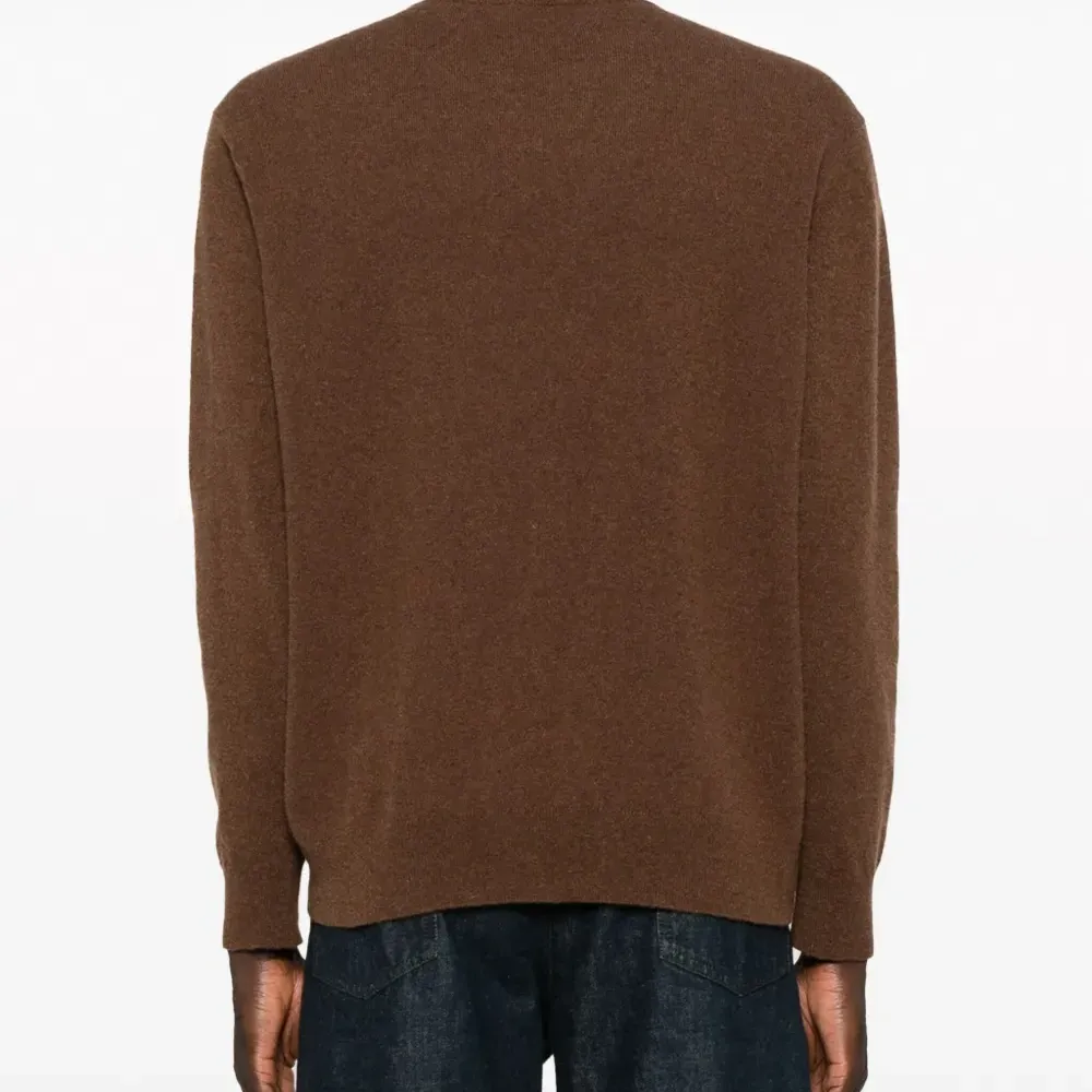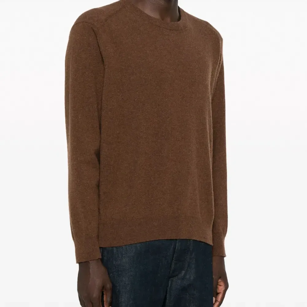 Шоколадный, смесовая шерсть, тонкая вязка, круглый вырез и длинные рукава. Это унисекс-модель. Обратите внимание, что для нее используется мужская размерная сетка.