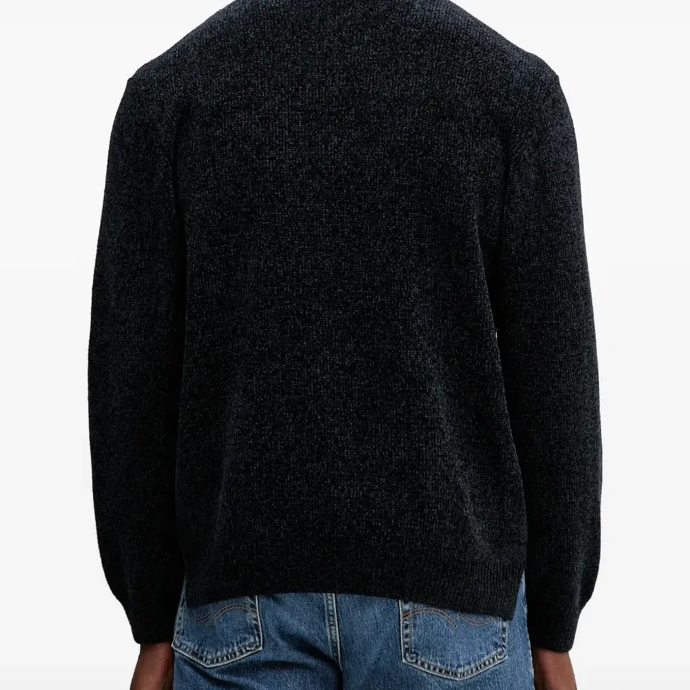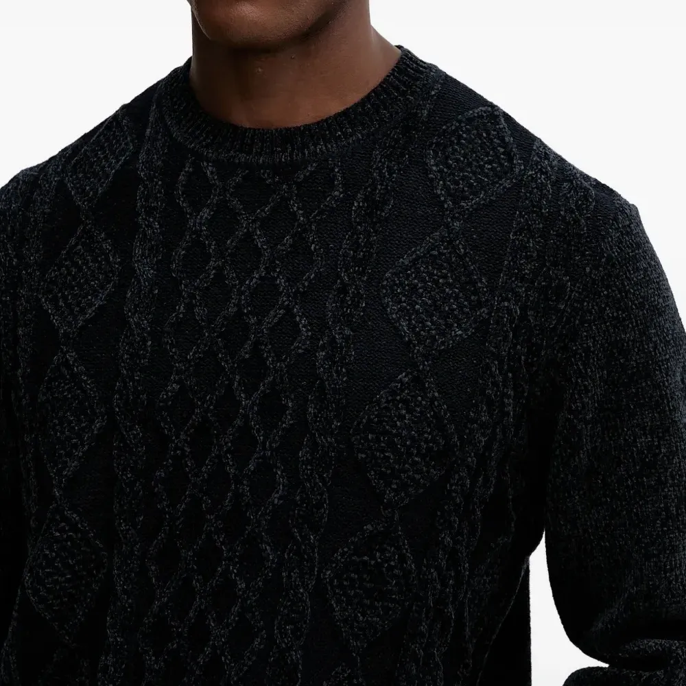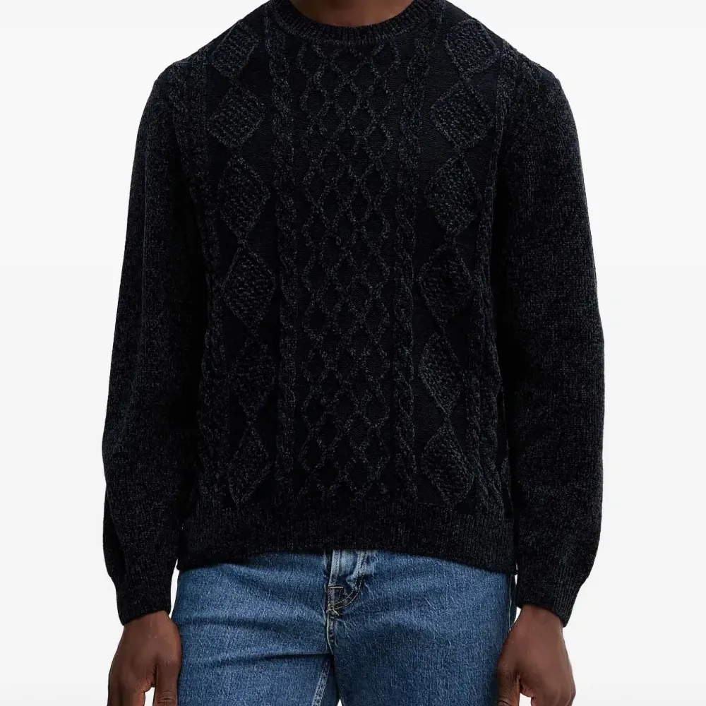 темно-синий вязаный свитер с узором, круглый вырез, длинные рукава