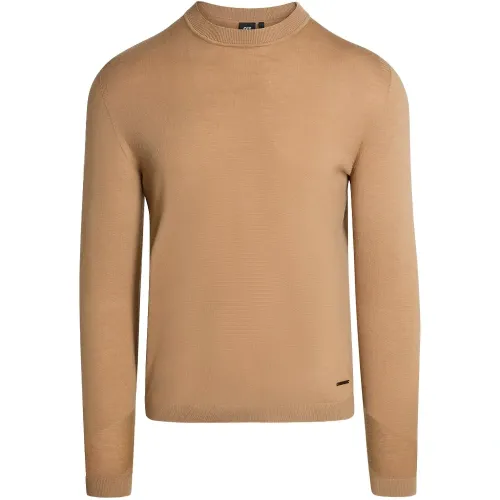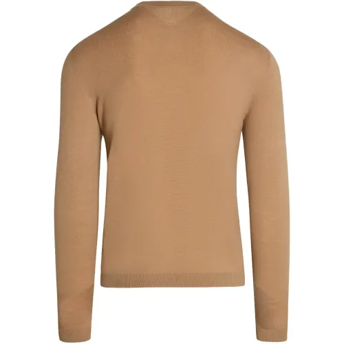 коричневый свитер с круглым вырезом, длинными рукавами, тоном логотипа, ребристым низом и манжетами