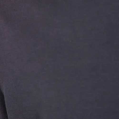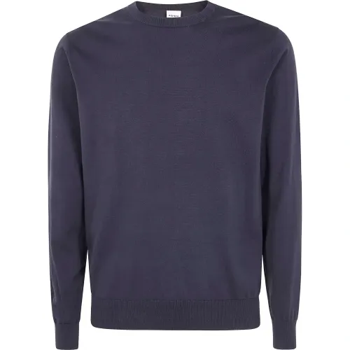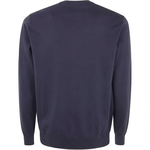 синий свитер с круглым вырезом, длинными рукавами и рубчатыми краями
