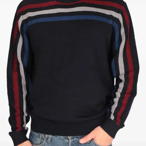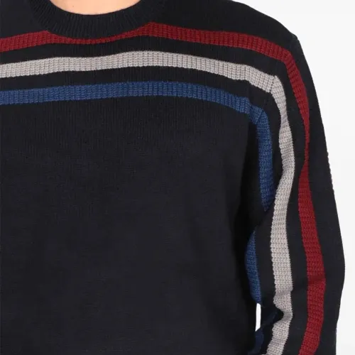 синий полосатый джемпер с круглым вырезом, длинными рукавами и ребристыми манжетами
