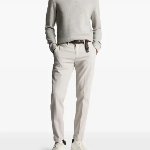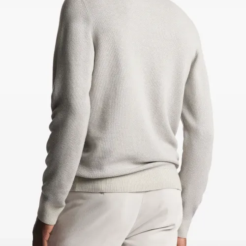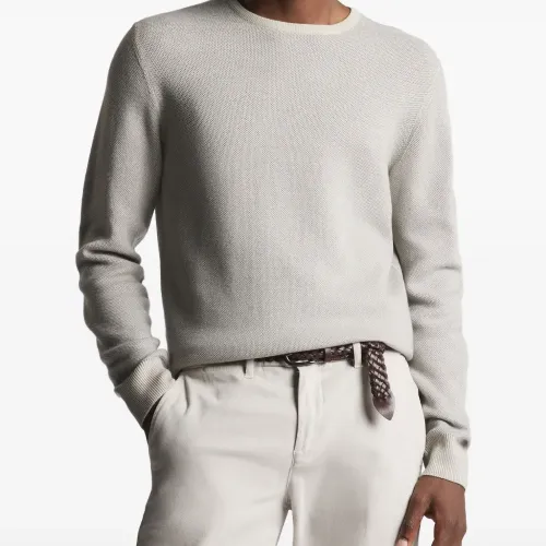 бежевый свитер с круглым вырезом, вязкой «сотовый узор», ребристыми краями и манжетами, с нашивкой-логотипом