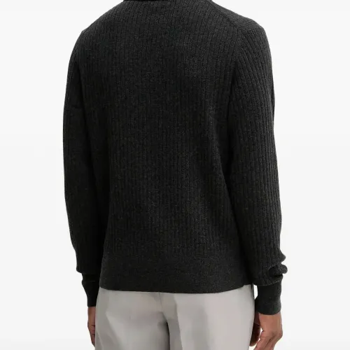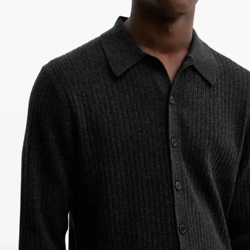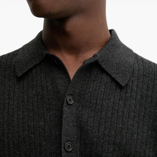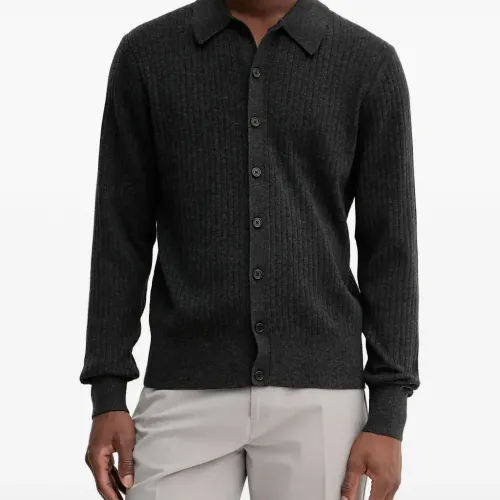 серый вязаный в рубчик пуловер с воротником-поло, застёжкой на пуговицы, длинными рукавами и прямым подолом