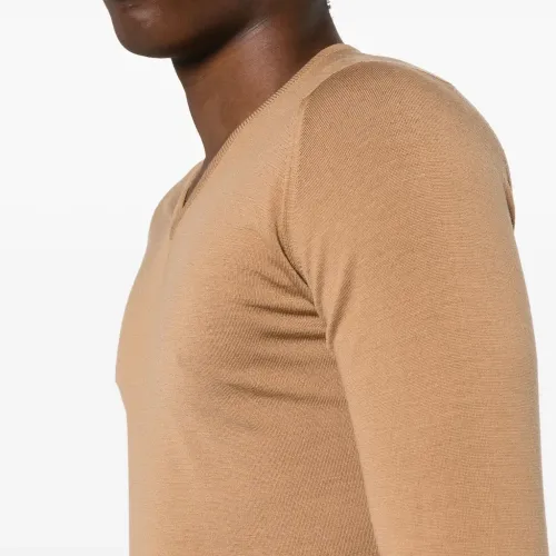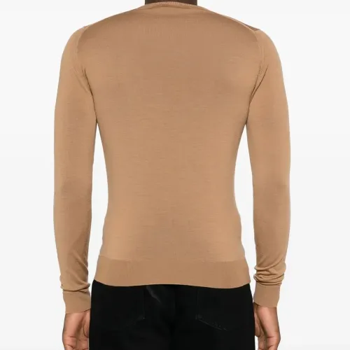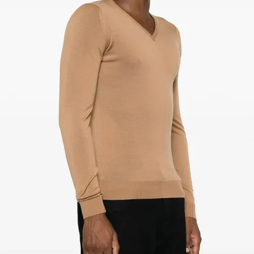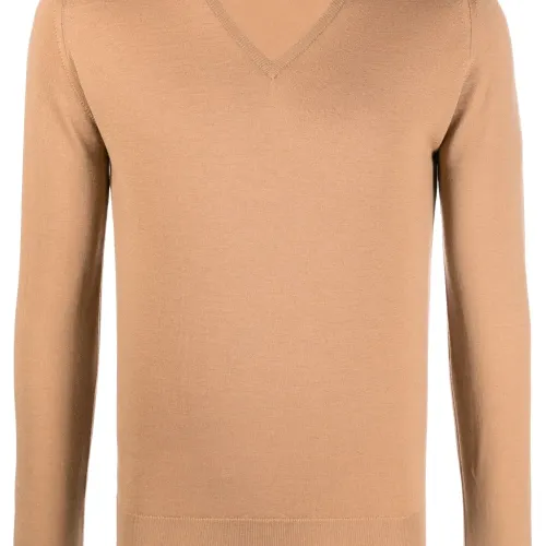 Бежево-коричневый, шерсть мериноса, тонкая вязка, V-образный вырез и длинные рукава.