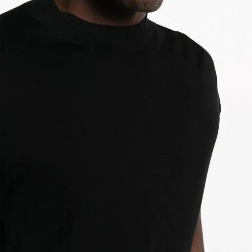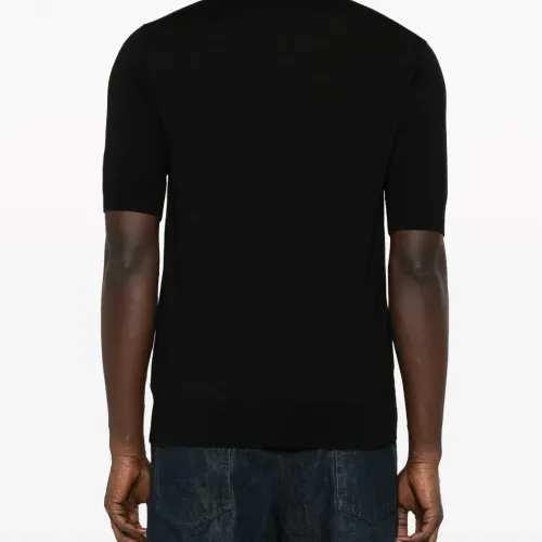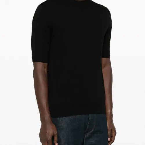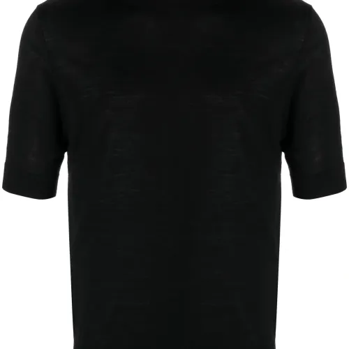Черный, шерсть, тонкая вязка, высокий воротник, короткие рукава и прямой подол.