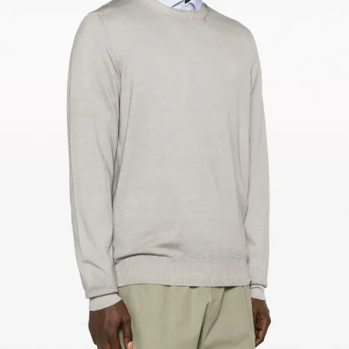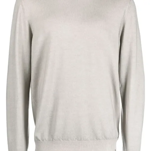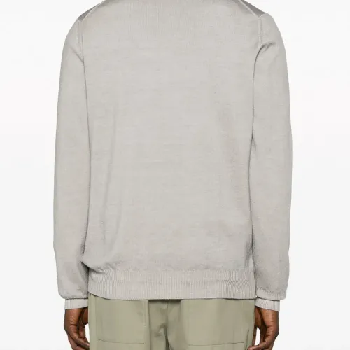 Светло-серый, необработанная шерсть, бирка с логотипом, круглый вырез, длинные рукава и прямой подол.