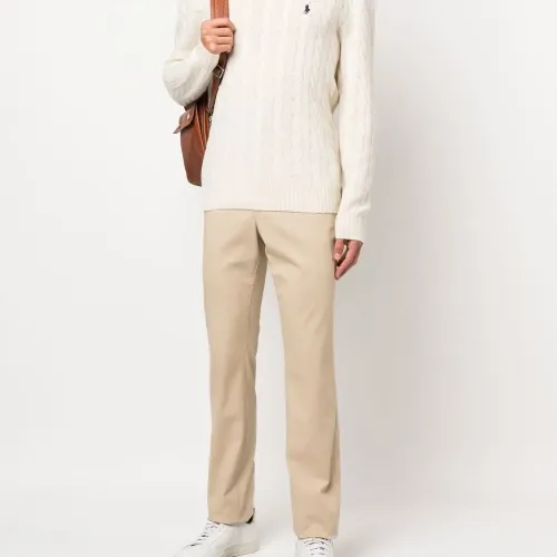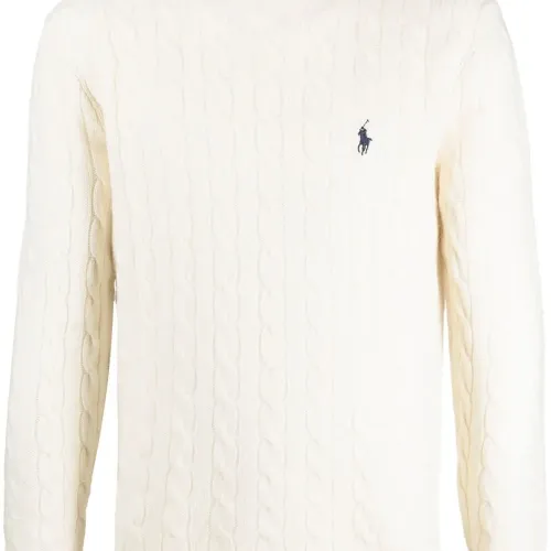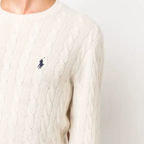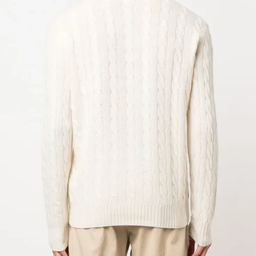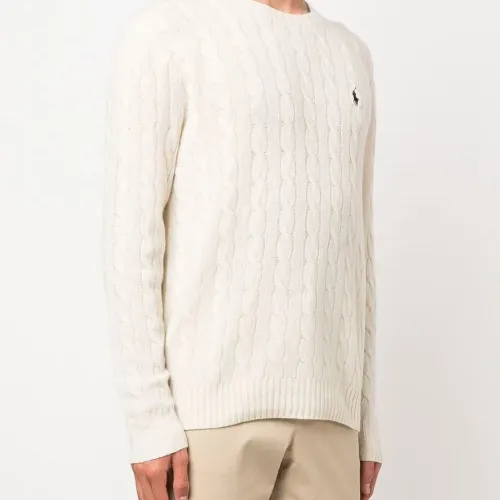 Кремово-белый, смесь шерсти и кашемира, вышитый логотип на груди, фактурная вязка, вязаные края в рубчик, круглый вырез, длинные рукава и прямой подол.