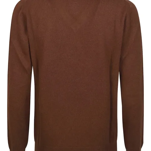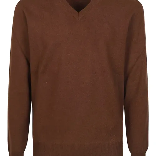 коричневый кашемировый свитер с V-образным вырезом, длинными рукавами, ребристыми манжетами и ребристым низом