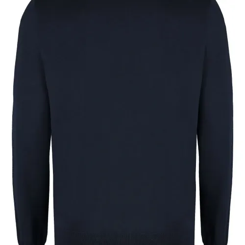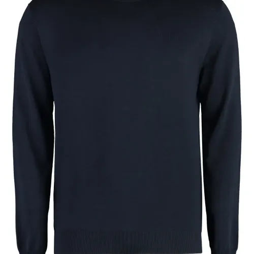темно-синий пуловер из смеси хлопка и шелка с ребристыми краями, круглым вырезом, длинными рукавами и прямым подолом