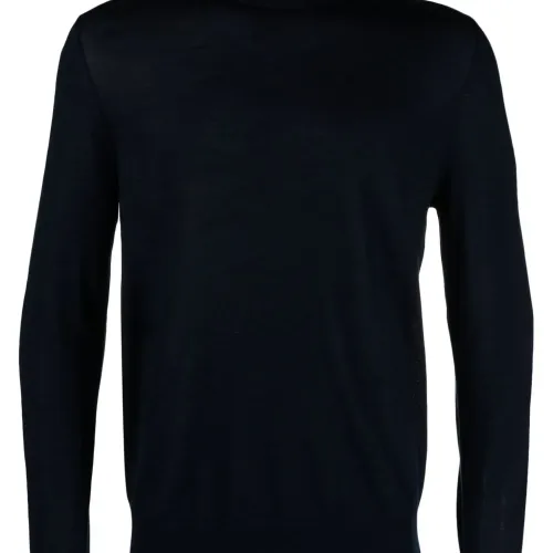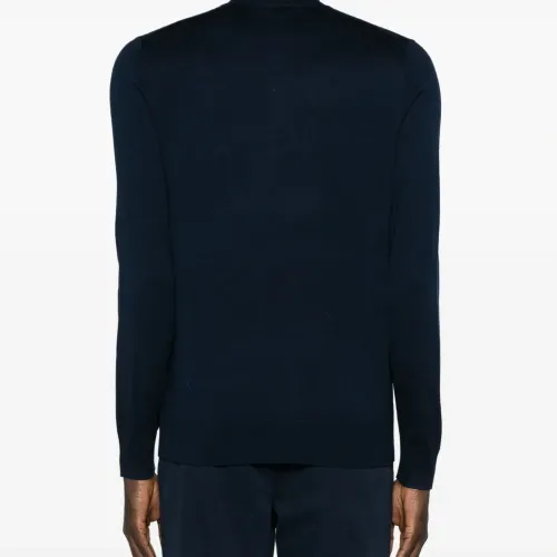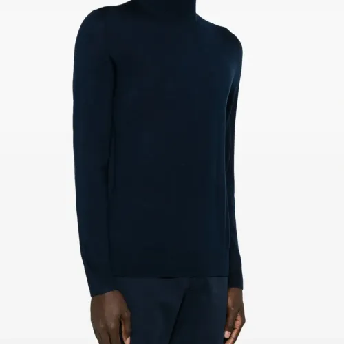 Темно-синий, шерсть мериноса, шелк, тонкая вязка, отделка в рубчик, высокий воротник, длинные рукава и прямой подол.