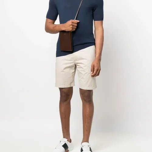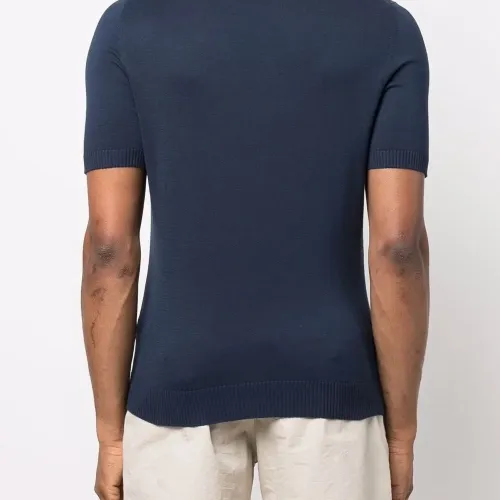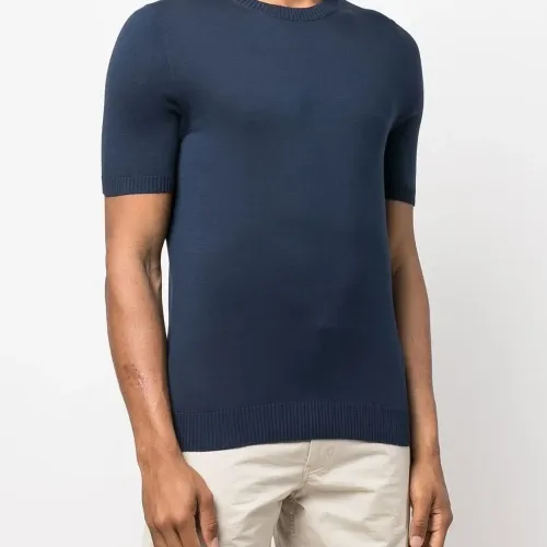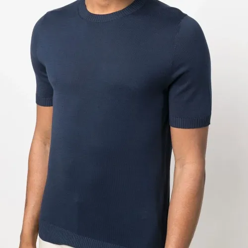 Трикотажный материал, круглый вырез и короткие рукава.
