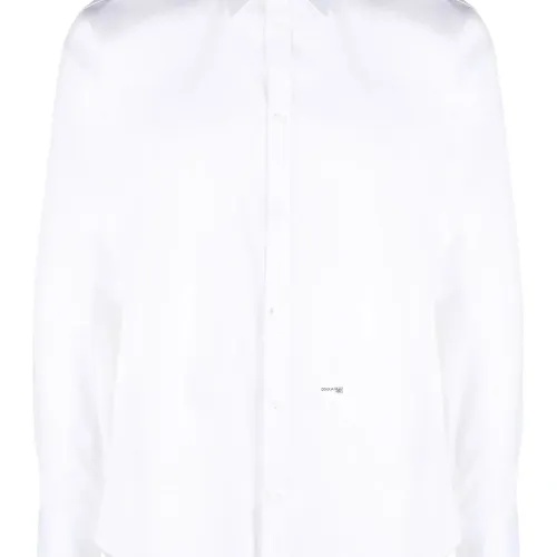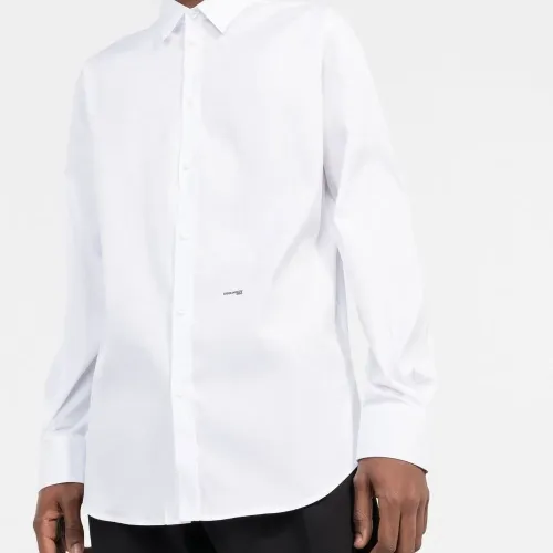 Белый, смесовый хлопок, логотип спереди, классический воротник, застежка на пуговицах спереди, длинные рукава и закругленный подол.