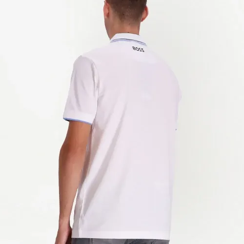 Белый, синий, черный, смесовый хлопок, вышитый логотип на груди, воротник поло, застежка на пуговицах спереди и короткие рукава.