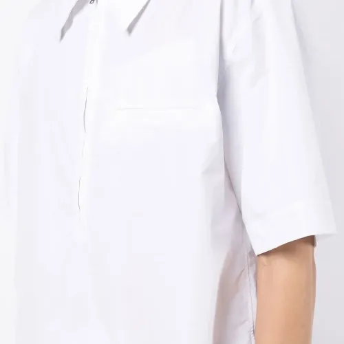 Белый, смесовый хлопок, воротник поло, застежка на молнии спереди, короткие рукава, прорезной карман на груди и прямой подол.