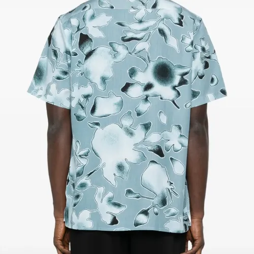 прозрачная голубая рубашка с цветочным принтом, застежкой на пуговицы и короткими рукавами