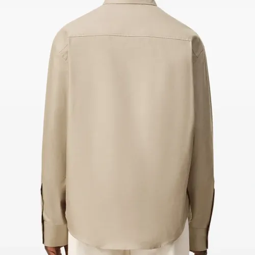 бежево-тауповая рубашка с вышивкой на груди, отложным воротником на пуговицах, застежкой на пуговицы и длинными рукавами