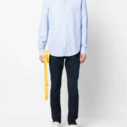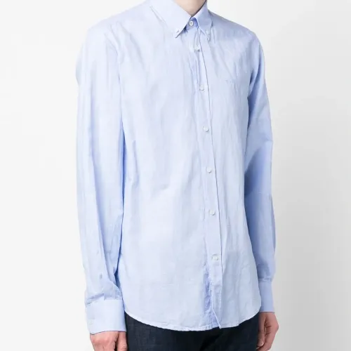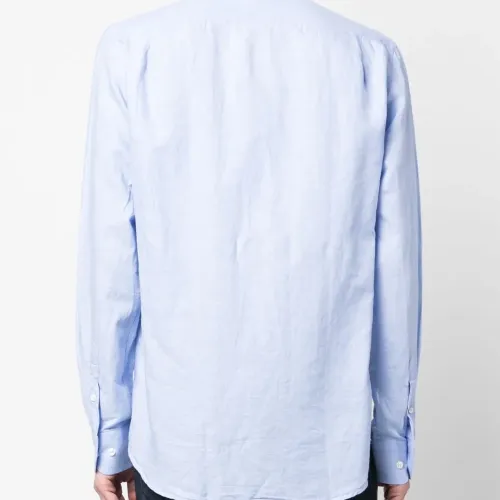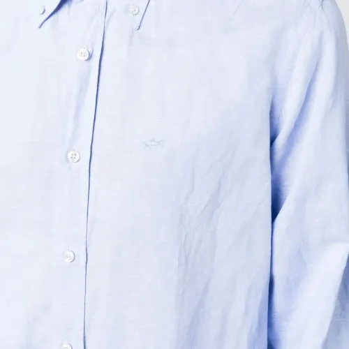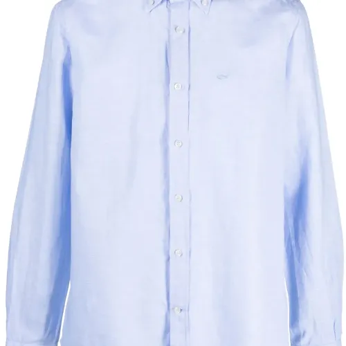Голубой, смесь хлопка и льна, вышитый логотип на груди, воротник на пуговицах, застежка на пуговицах спереди, длинные рукава, манжеты на пуговицах и закругленный подол.