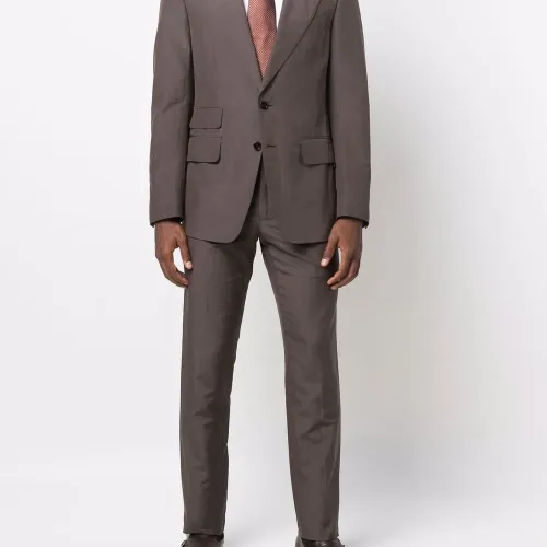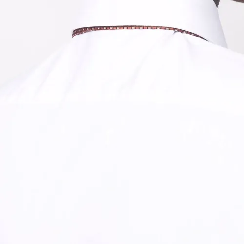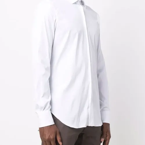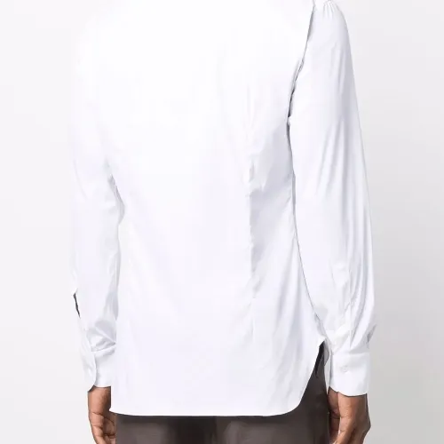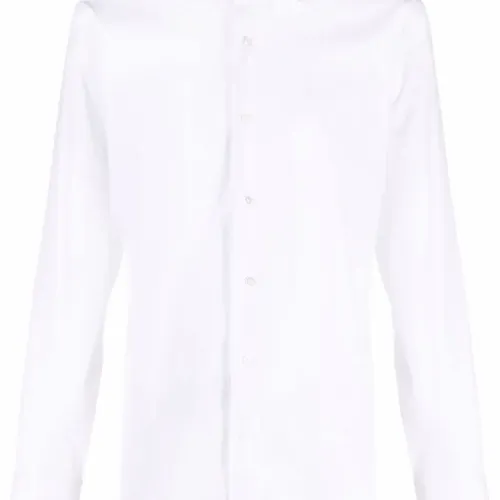 Прямой воротник, застежка на пуговицах спереди, длинные рукава, манжеты на пуговицах и закругленный подол.