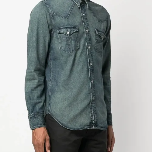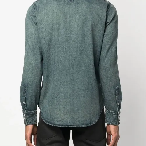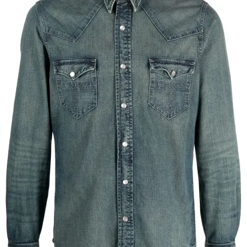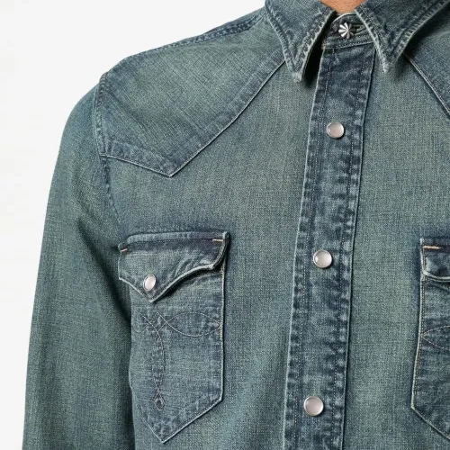 Хлопок, обработанный деним, вставки в стиле вестерн, застежка на кнопках спереди, плоский заостренный воротник, два накладных кармана на груди, длинные рукава, манжеты с застежкой на кнопки и закругленный подол.